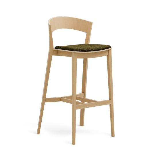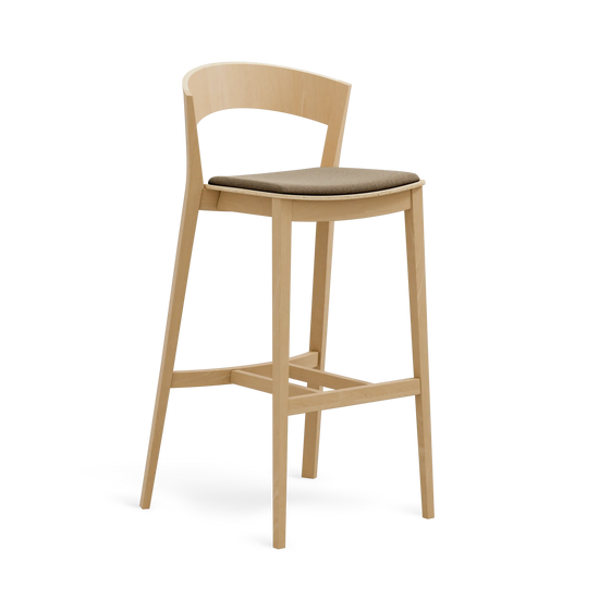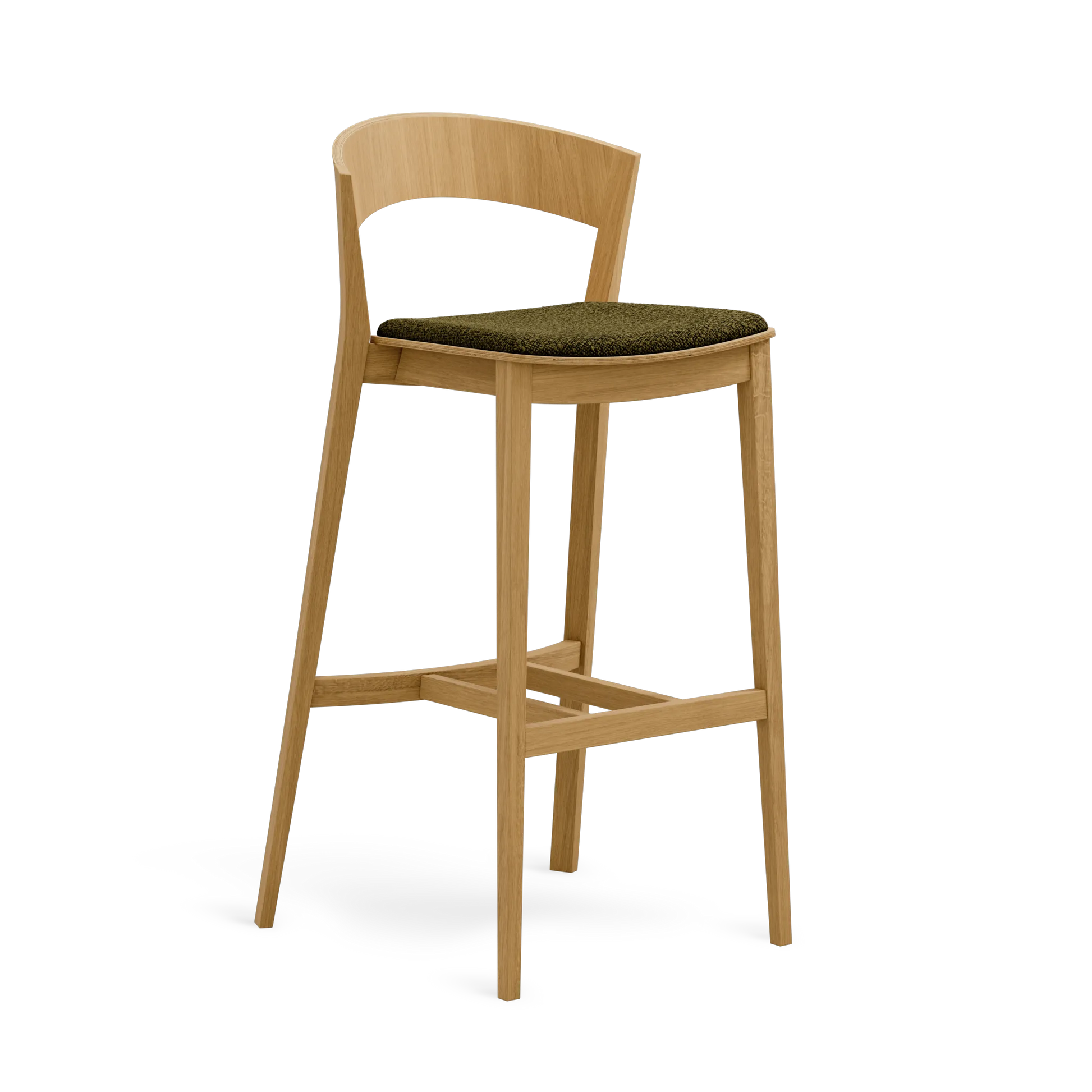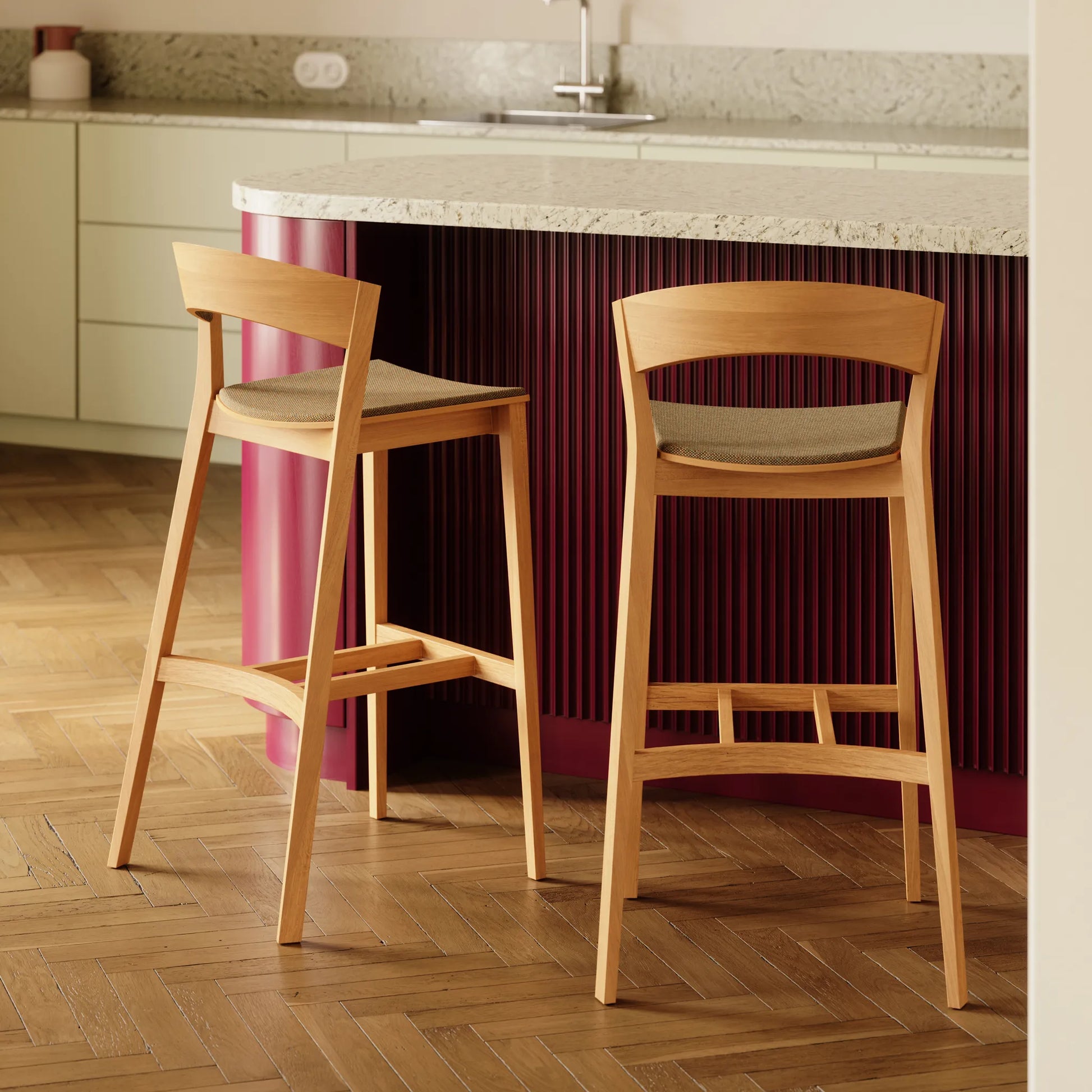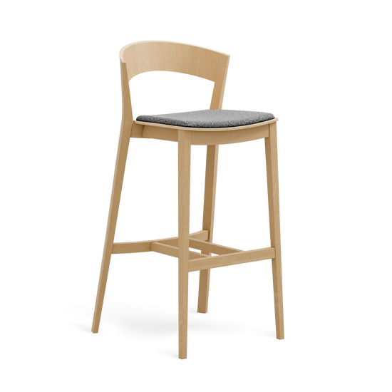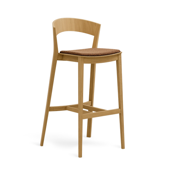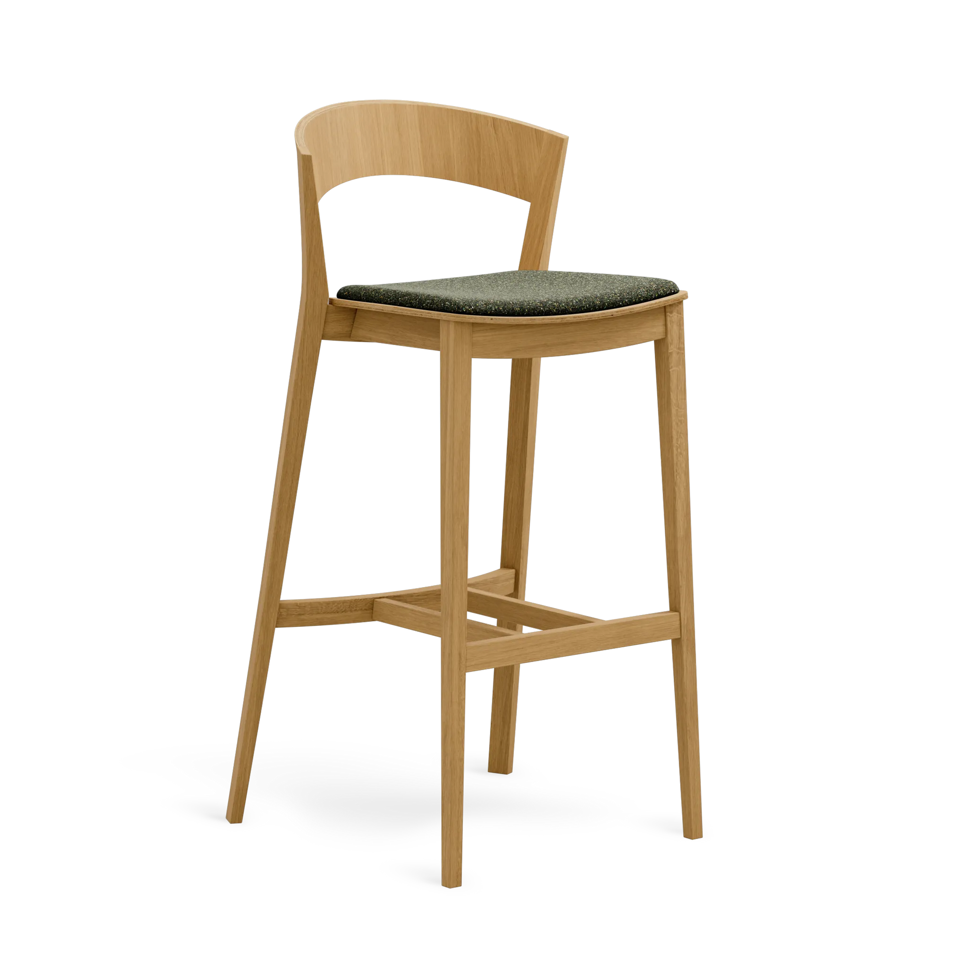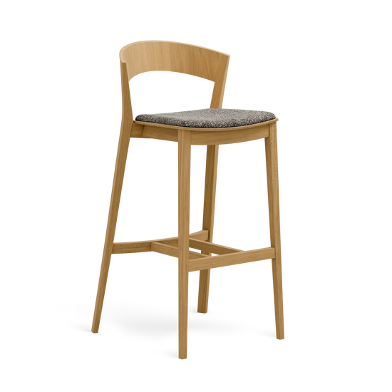 Hoker jest wykonany z litego drewna, z tapicerowanym siedziskiem – do wyboru w wersji bukowej lub dębowej, w różnych wybarwieniach i tkaninach. Miękkie siedzisko i ergonomiczne oparcie zapewniają wygodę, nawet podczas dłuższego użytkowania.
