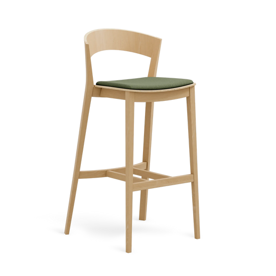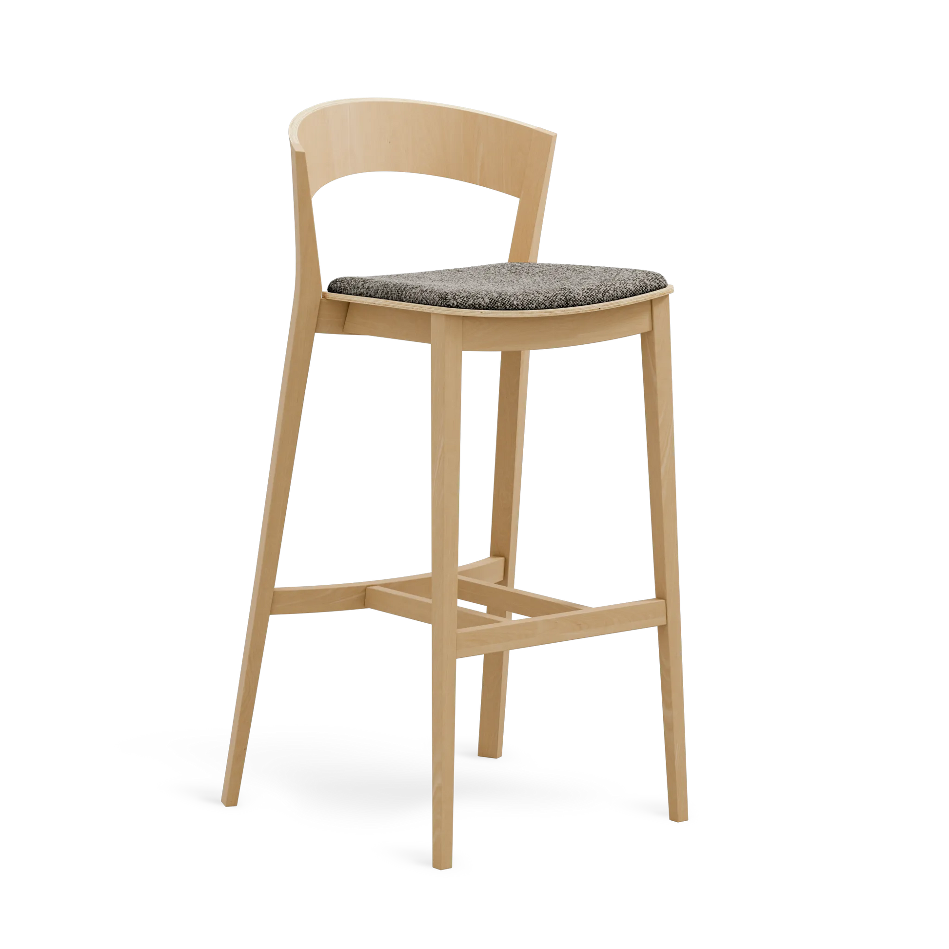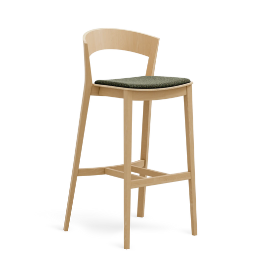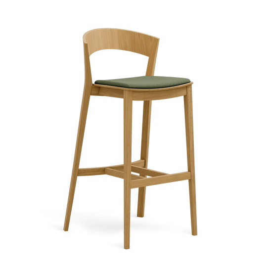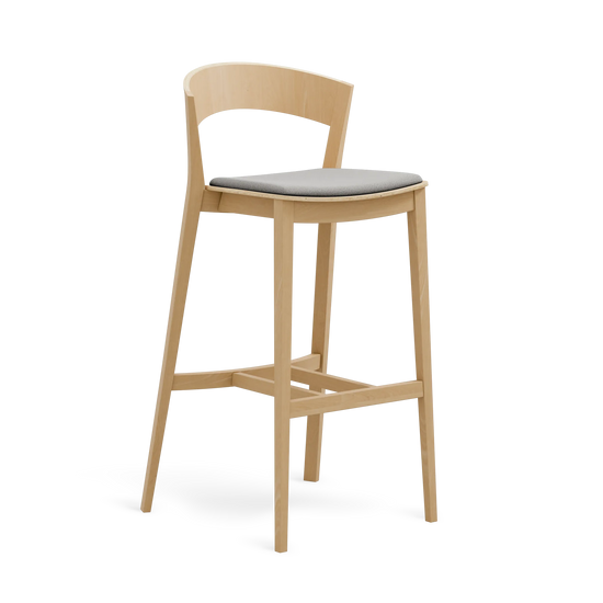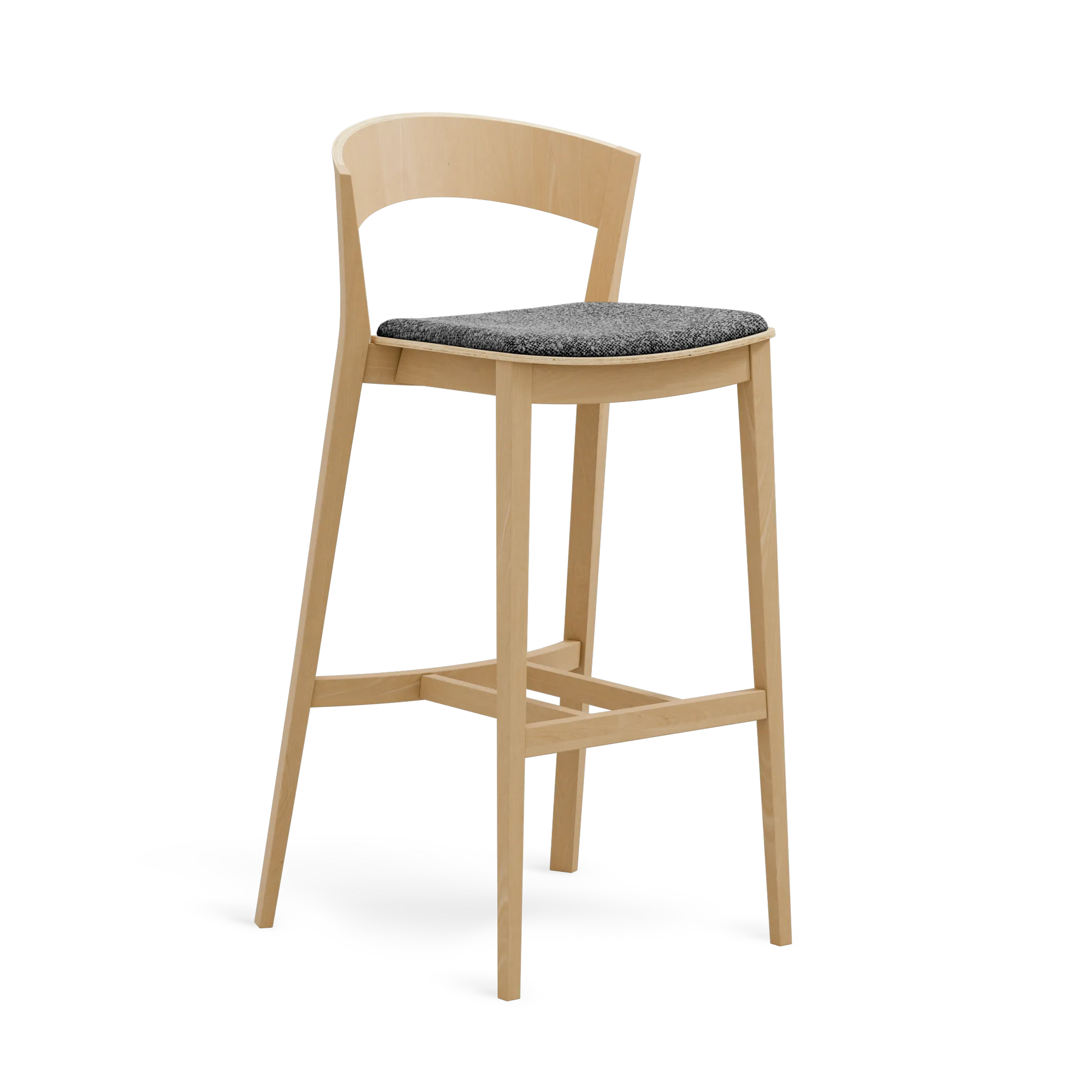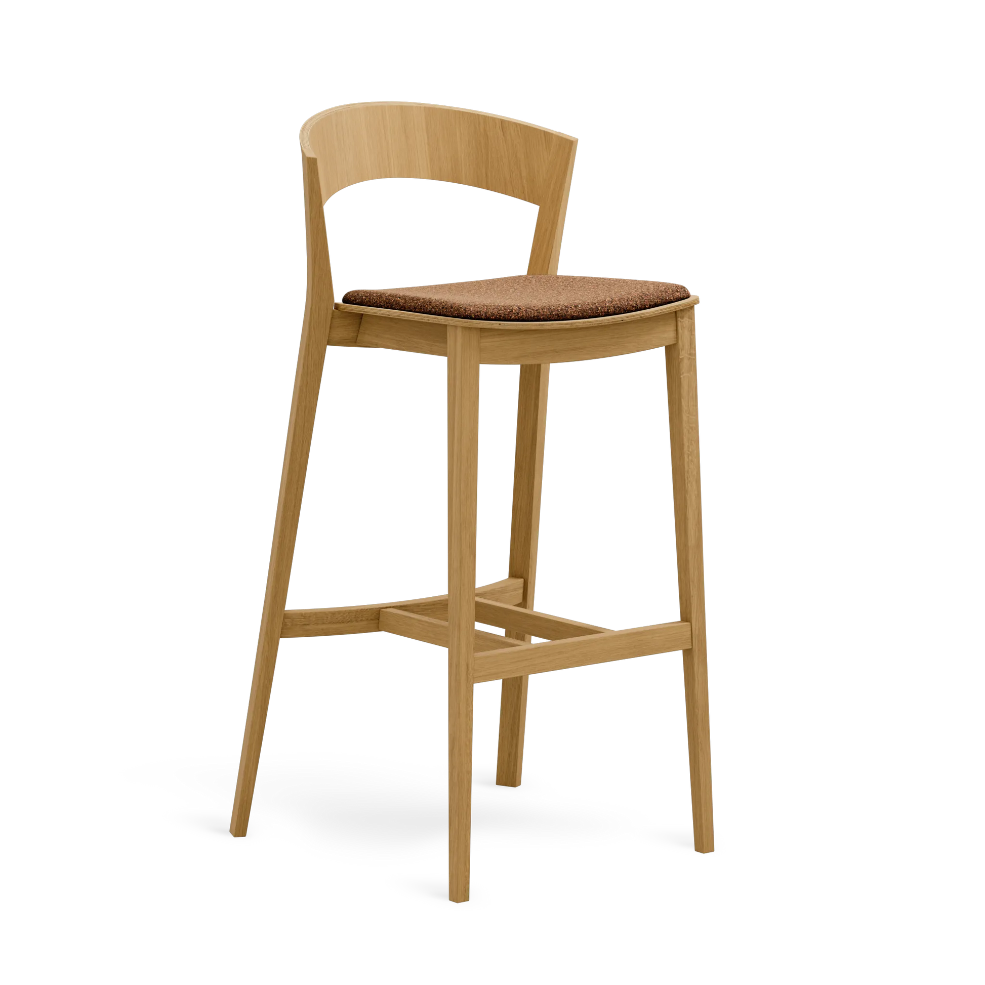 Hoker jest wykonany z litego drewna, z tapicerowanym siedziskiem – do wyboru w wersji bukowej lub dębowej, w różnych wybarwieniach i tkaninach. Miękkie siedzisko i ergonomiczne oparcie zapewniają wygodę, nawet podczas dłuższego użytkowania.