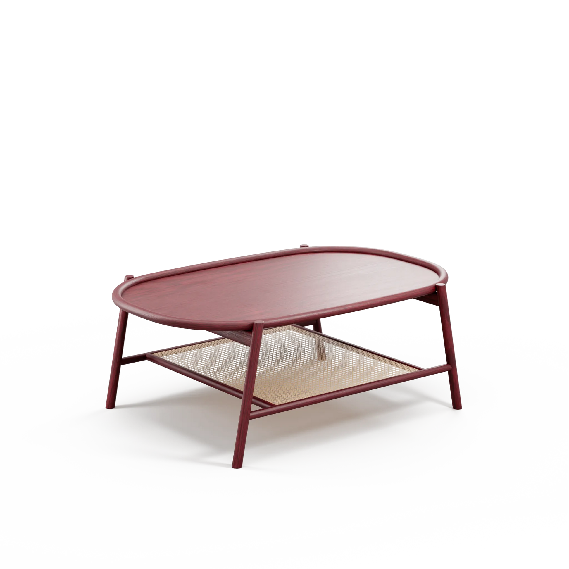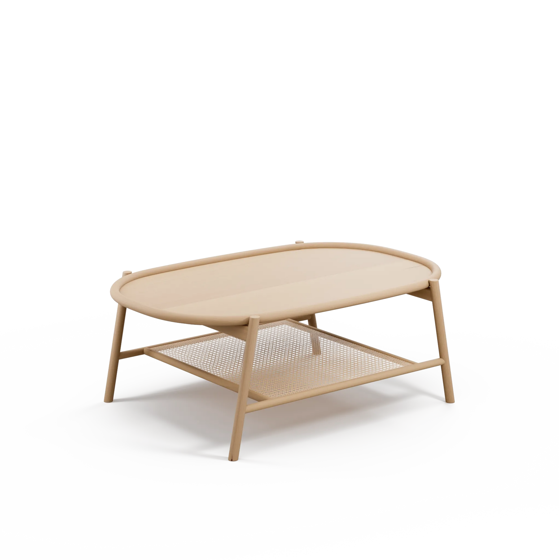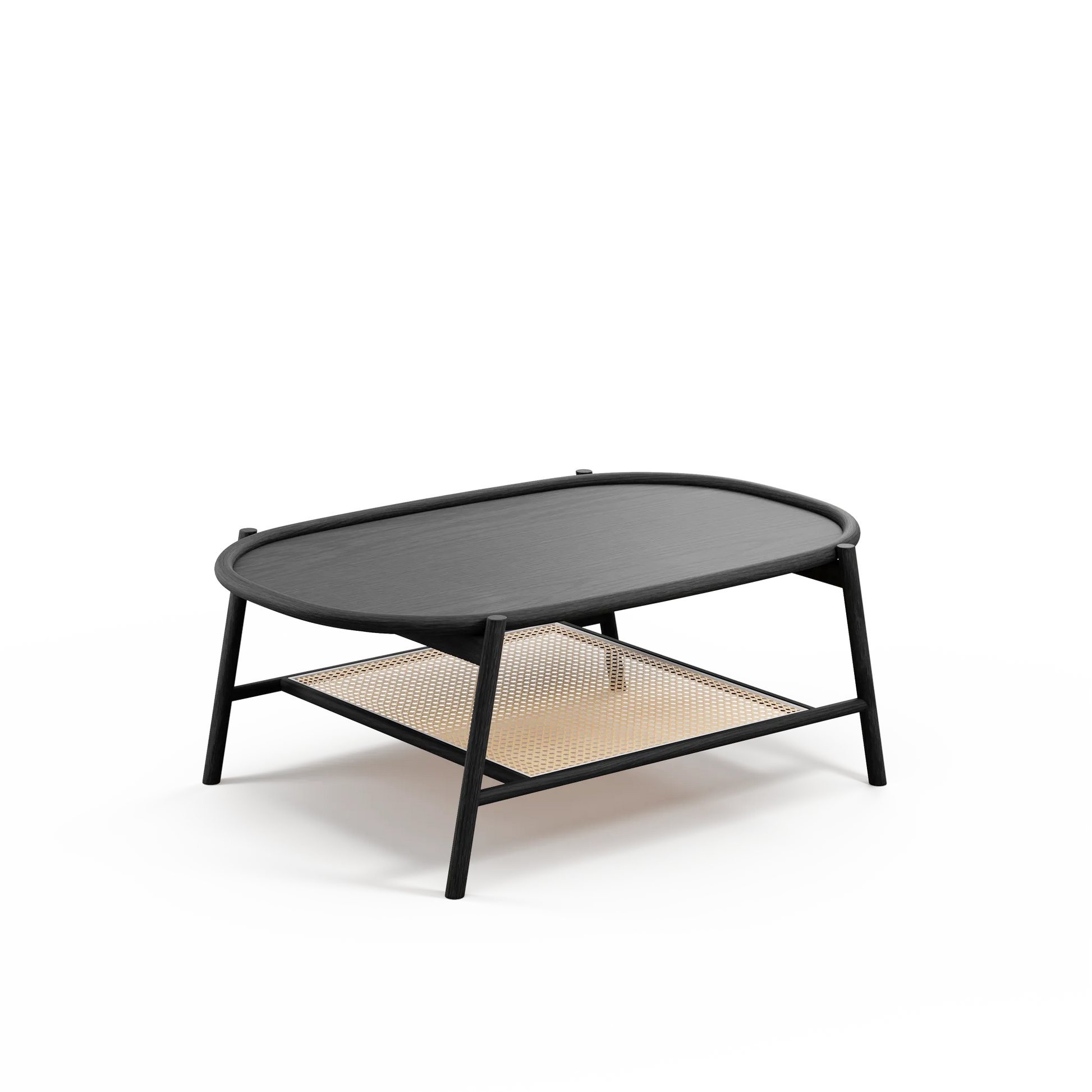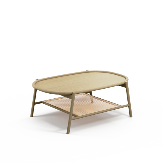 Drum M to lekki, zarówno wizualnie, jak i fizycznie, stolik kawowy. Drewniany blat stolika zamknięty został w obłej pętli z gięciny, a dolna półka, lekka i ażurowa, to naturalny wyplot, naciągnięty na drewnianej ramie. To od właściwego naciągu zależy jakość mebla i właśnie ten element, napięty jak bębenek, stał się inspiracją dla nazwy.