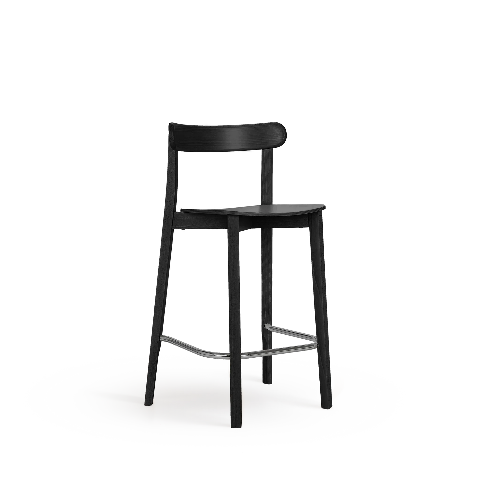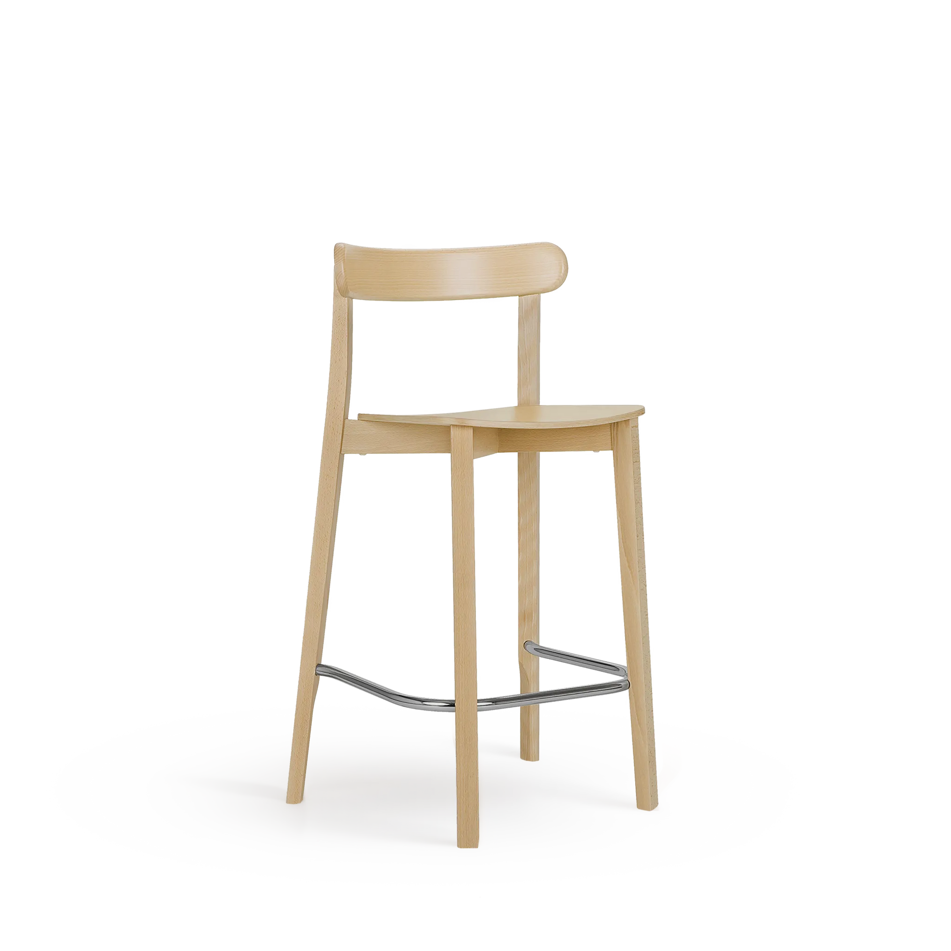 Wykonany w całości z drewna bukowego – siedzisko ze sklejki, pozostałe elementy z litego drewna. Stabilna konstrukcja i delikatnie wygięte nogi zapewniają komfort użytkowania, a metalowa listwa pod stopami pełni funkcję podpórki i podkreśla nowoczesny charakter mebla.