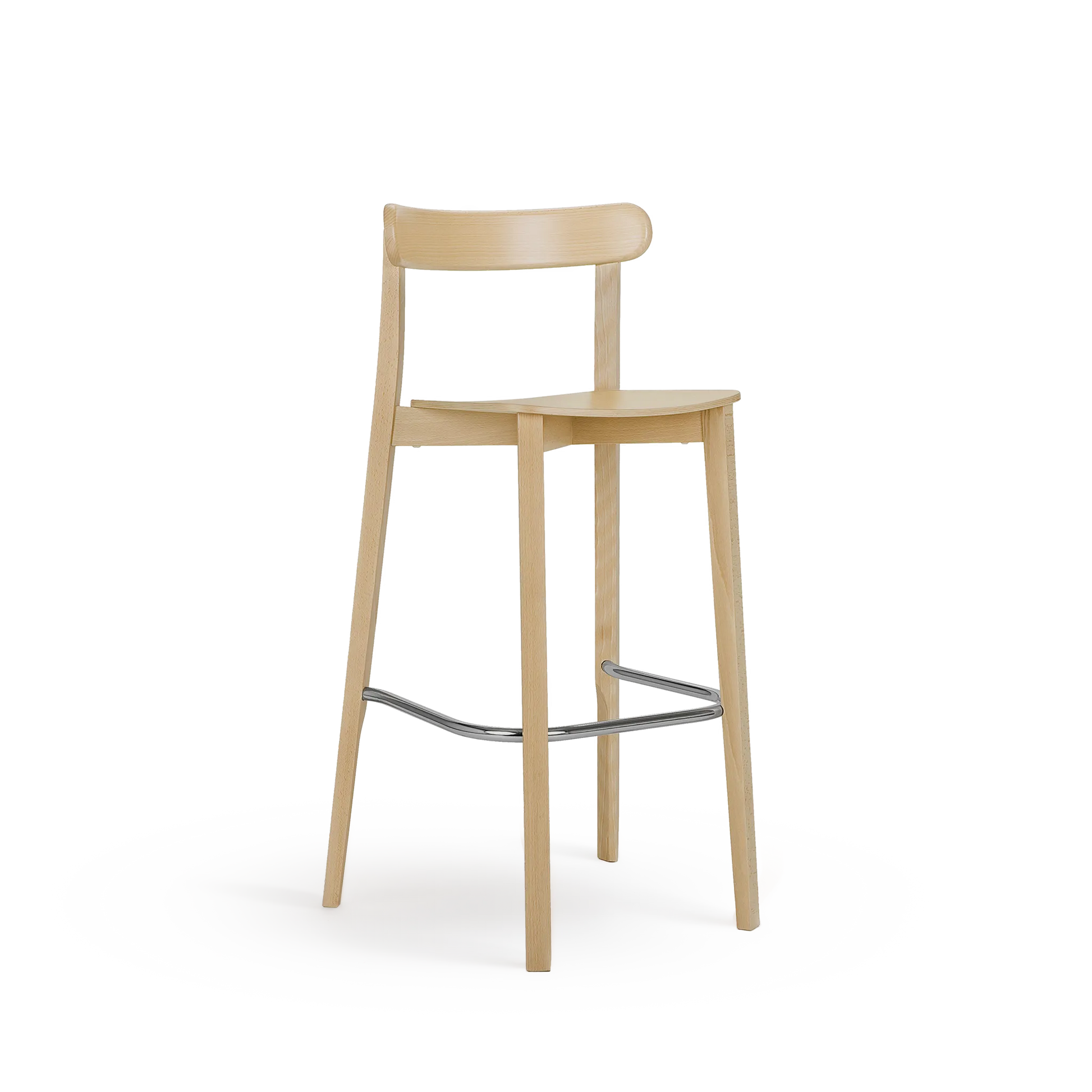 Wykonany w całości z drewna bukowego – siedzisko ze sklejki, pozostałe elementy z litego drewna. Stabilna konstrukcja i delikatnie wygięte nogi zapewniają komfort użytkowania, a metalowa listwa pod stopami pełni funkcję podpórki i podkreśla nowoczesny charakter mebla.
