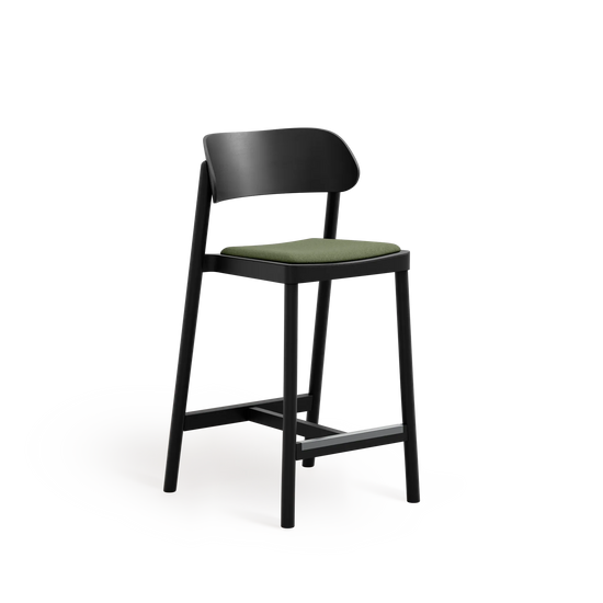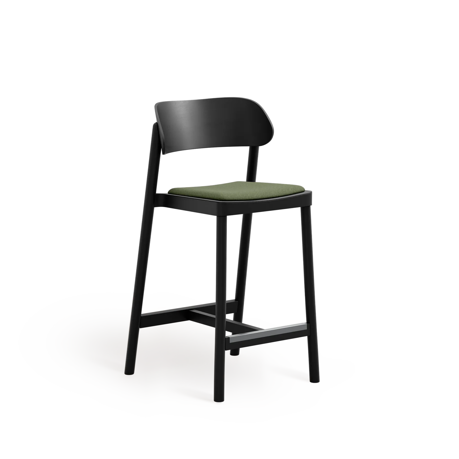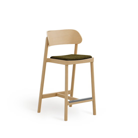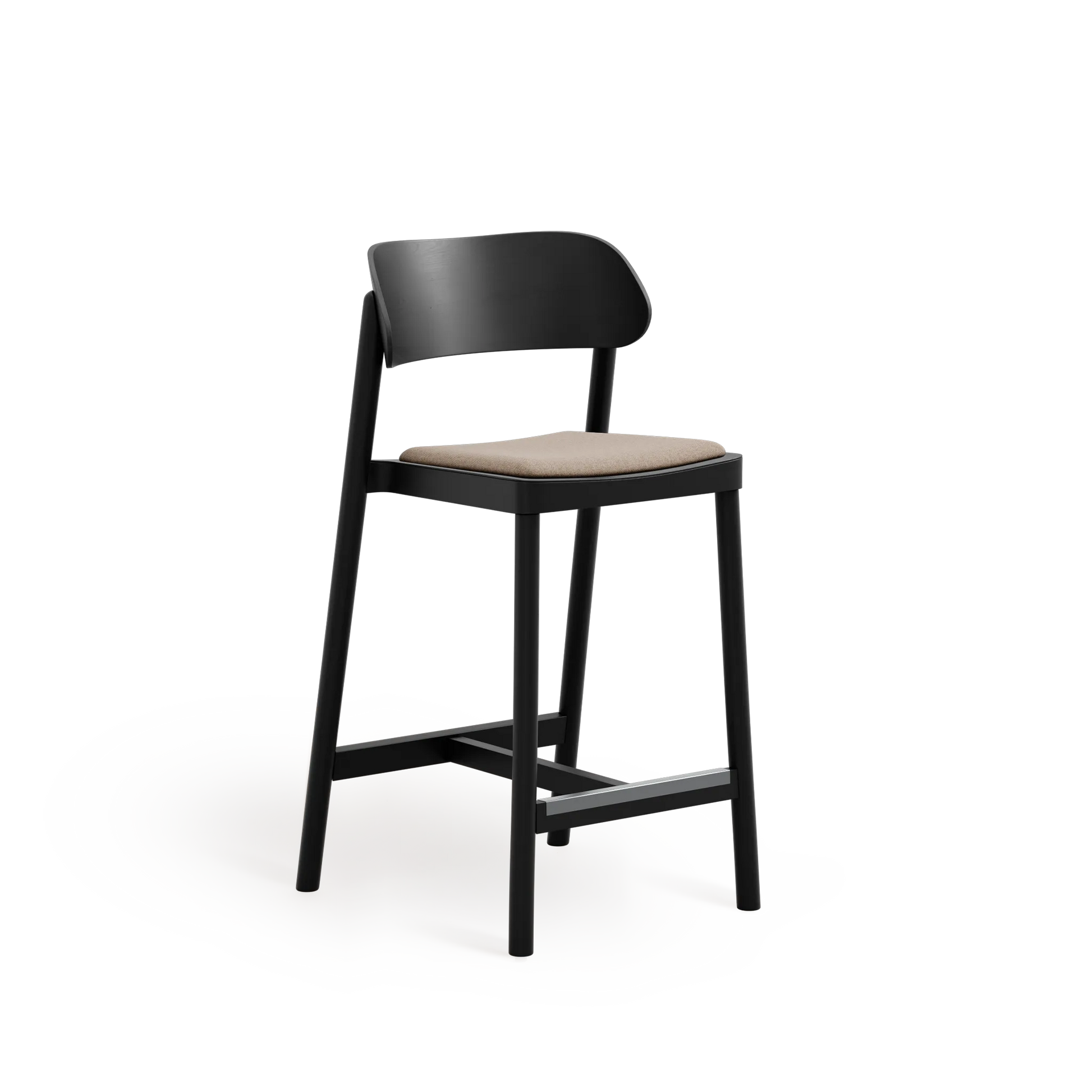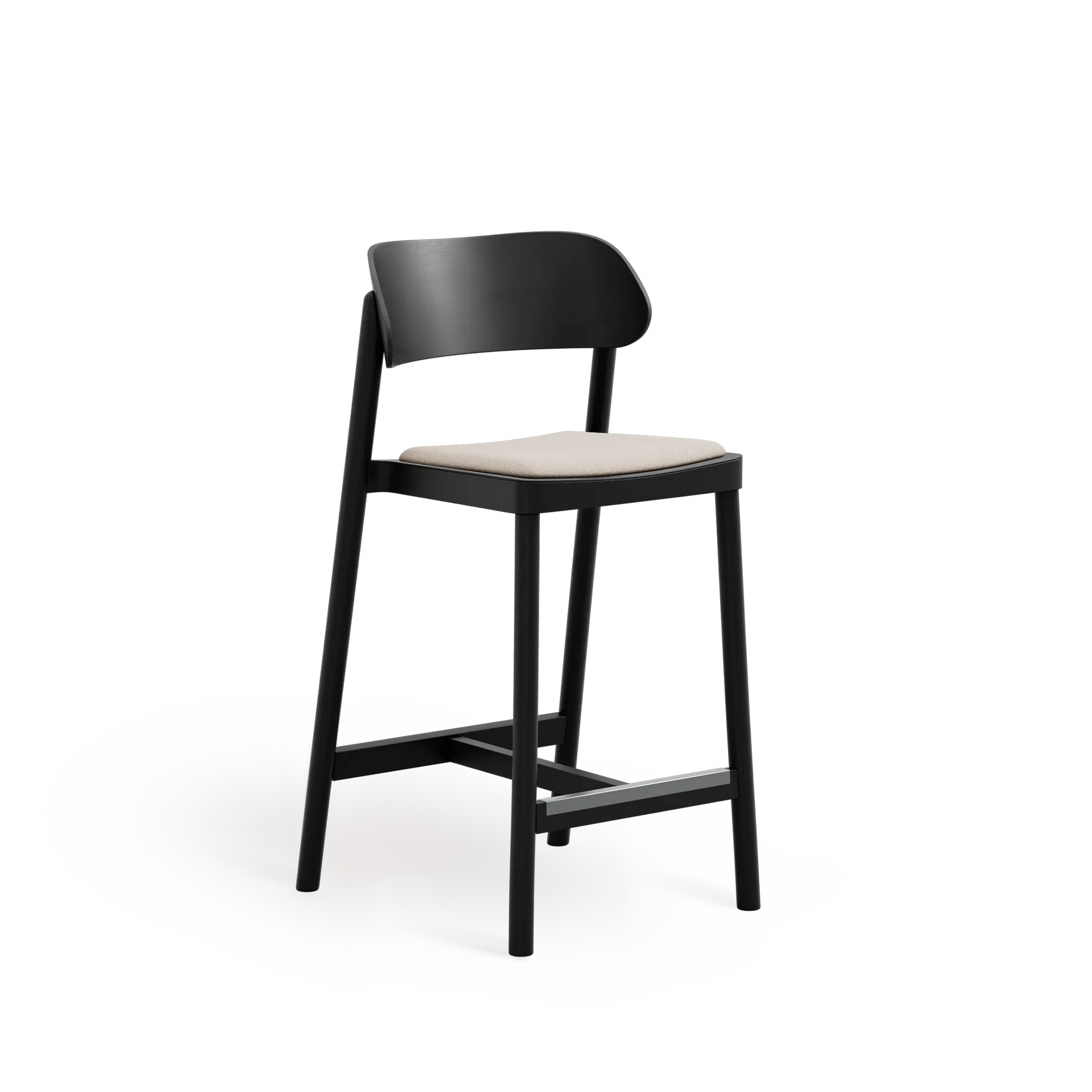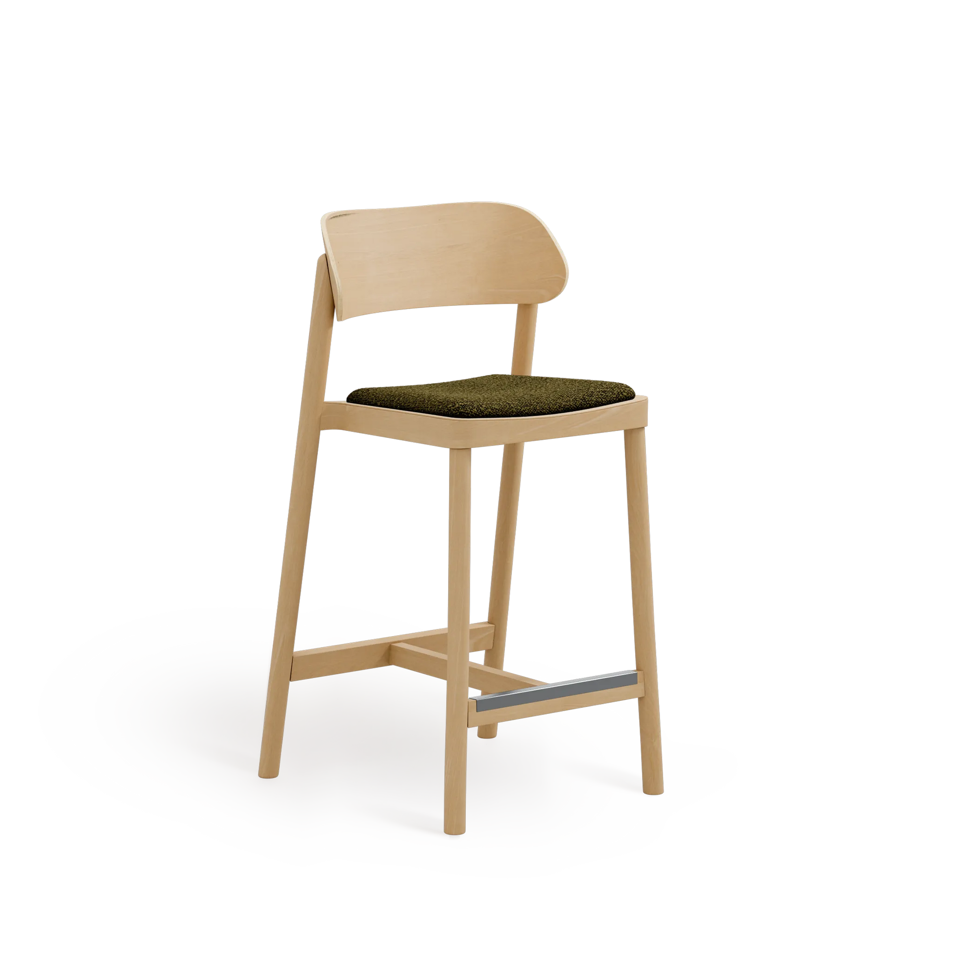 Tapicerowane siedzisko zwiększa wygodę użytkowania, nie zaburzając minimalistycznej formy całego mebla. Profilowane, drewniane oparcie oraz konstrukcja z litego drewna bukowego podkreślają jego trwałość i elegancki charakter. To mebel zaprojektowany tak, aby wpisywał się w estetykę nowoczesnych wnętrz, zachowując równocześnie subtelny i uniwersalny wyraz.