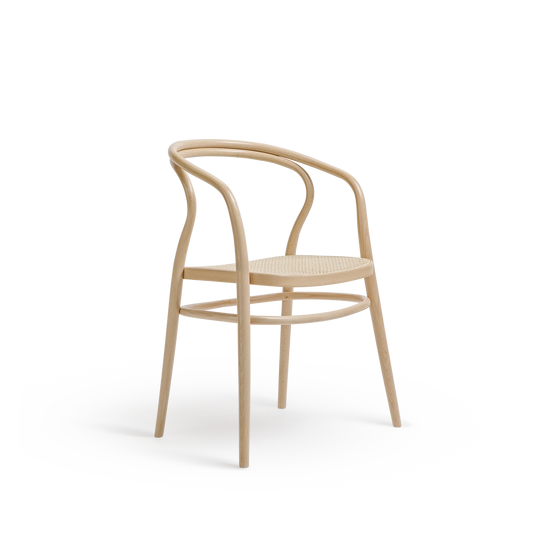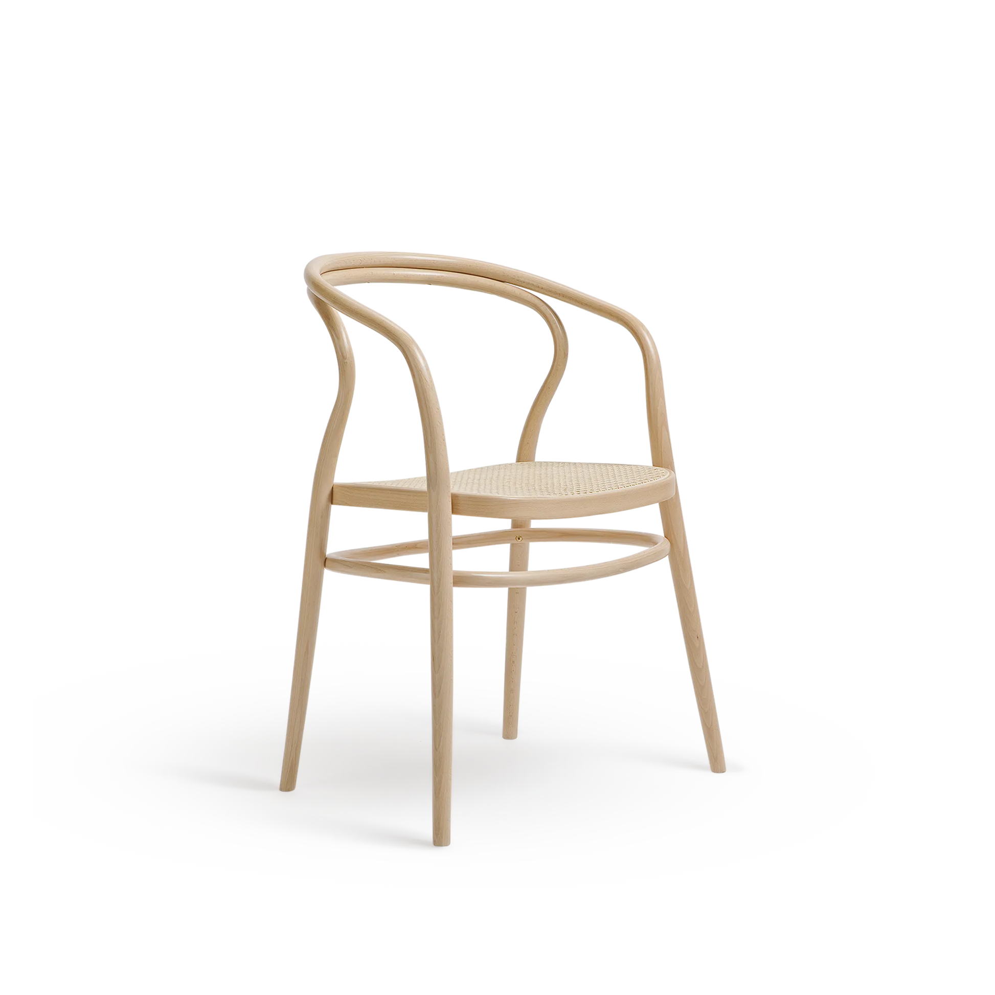 Nodo B-1400 to fotel łączący lekkość giętego drewna z wyrazistą formą. Charakterystyczne połączenie przednich i tylnych nóg w górnej części oparcia tworzy elegancki, płynny łuk podkreślający miękką linię mebla. Gięta konstrukcja z drewna bukowego i plecione elementy z naturalnej maty na siedzisku i oparciu wnoszą subtelny, rzemieślniczy detal i szlachetne materiały.