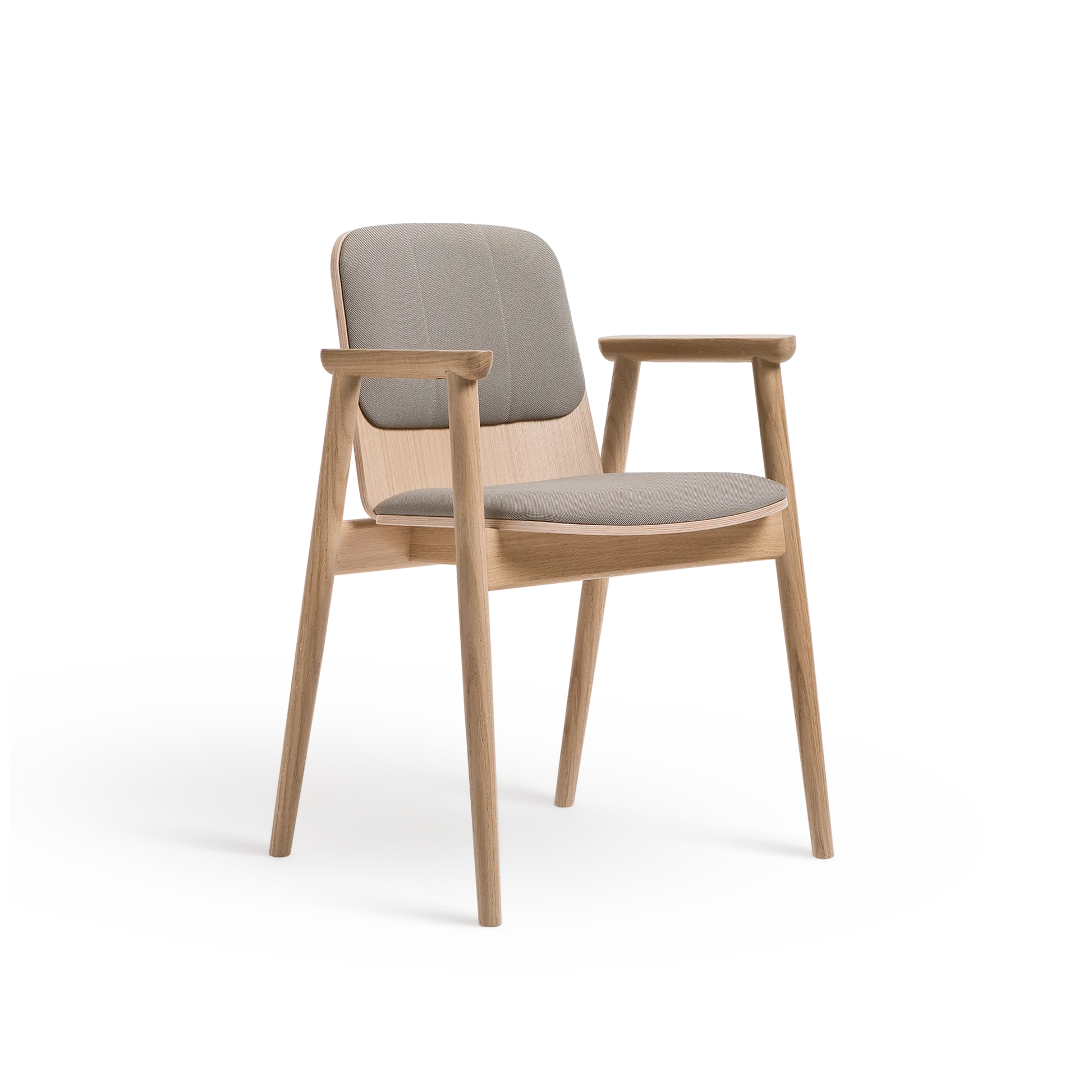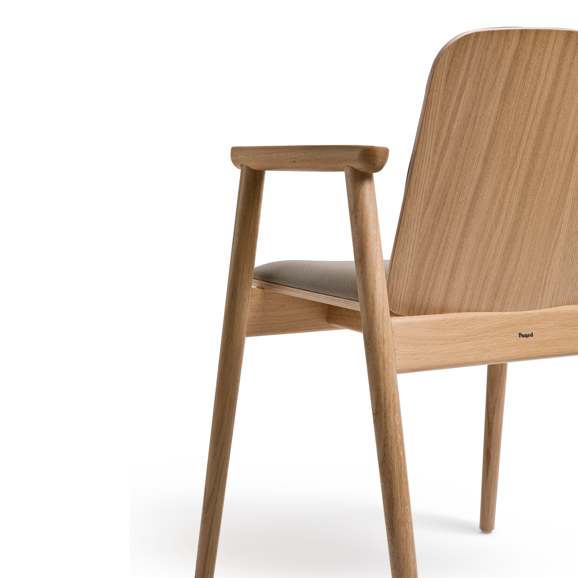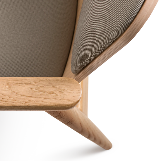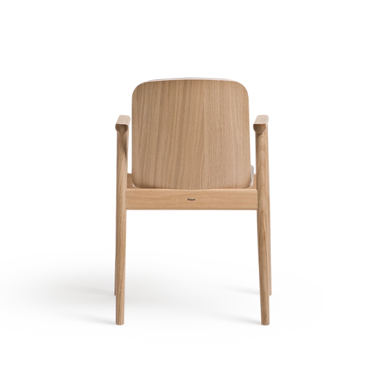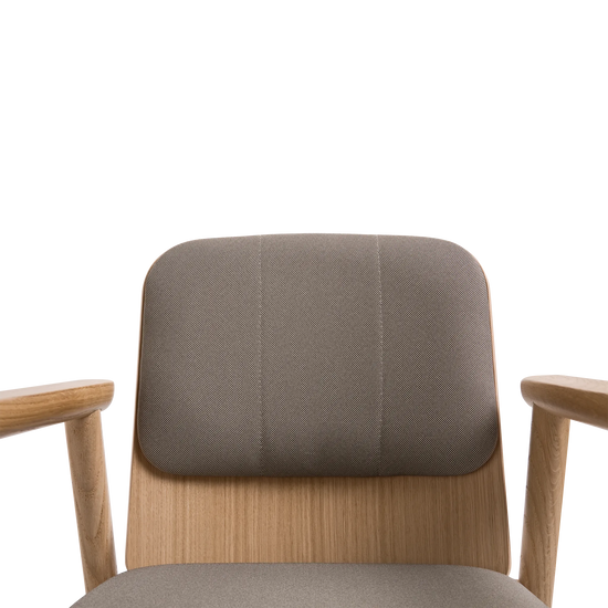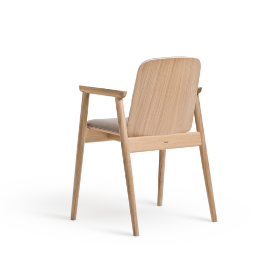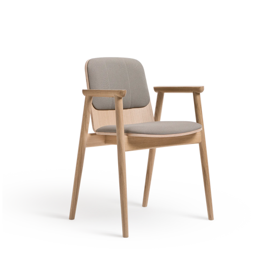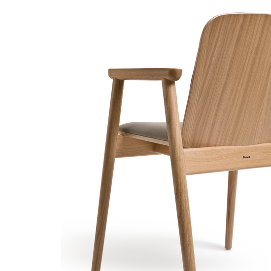 Kolekcja Prop charakteryzuje się oszczędnym podejściem do formy. Konstrukcja opiera się na toczonych drewnianych nogach, zestawionych z siedziskiem tapicerowanym wysokiej jakości tkaniną oraz tapicerowanym oparciem z profilowanej sklejki. Dyskretne łączenia elementów podkreślają kunszt wykonania, a starannie dobrany kąt nachylenia oparcia oraz podłokietniki z litego drewna zapewniają wysoki komfort użytkowania.