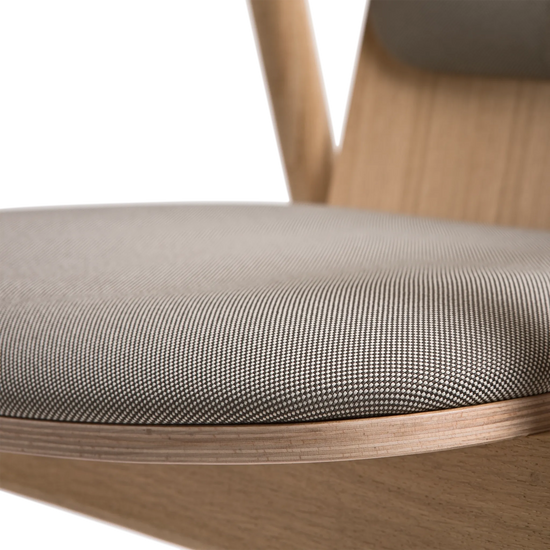 Tapicerowane siedzisko i oparcie zwiększają wygodę siedzenia i subtelnie ocieplają wizualny odbiór mebla, zachowując jednocześnie lekkość i oszczędny charakter formy.
