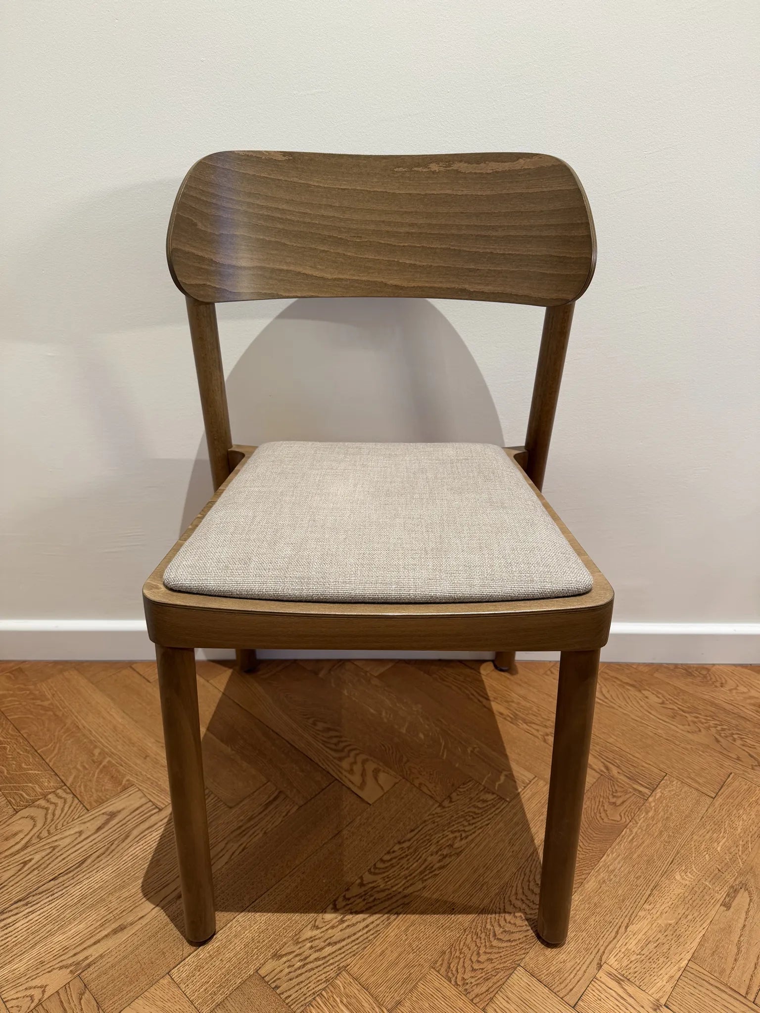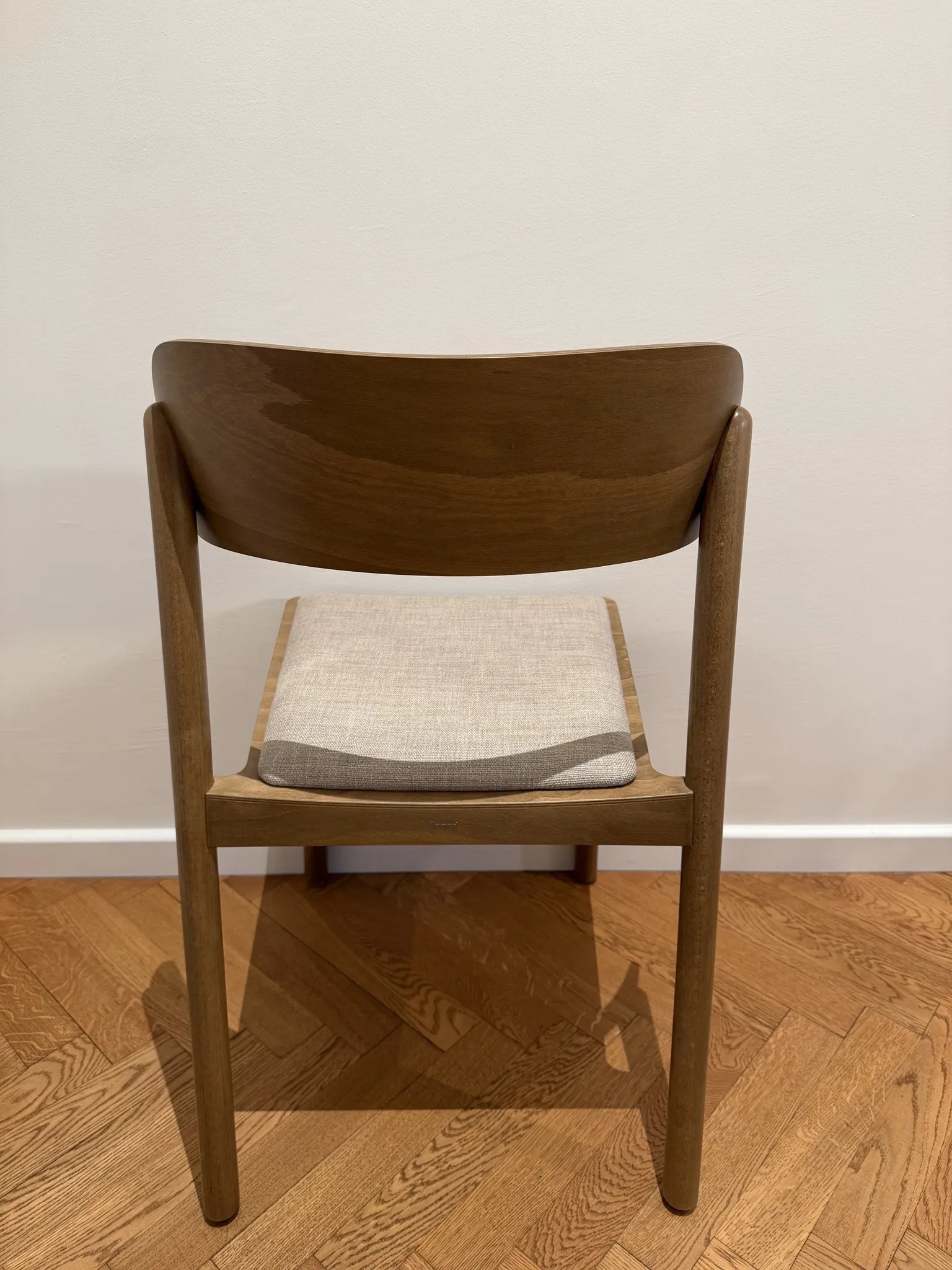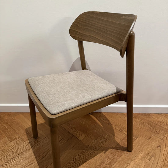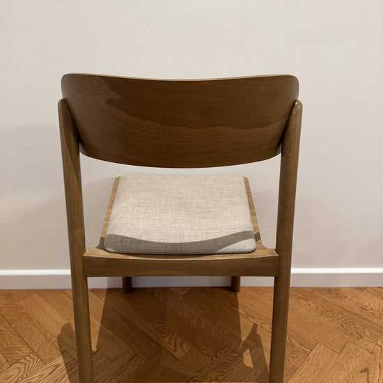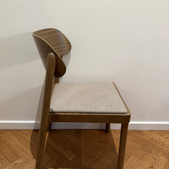Subtelnie wyprofilowane oparcie oraz łagodnie zaokrąglone nogi nadają formie lekkości, przy jednoczesnym zachowaniu trwałości i stabilności. Wysokiej jakości tapicerka zwiększa komfort użytkowania, nie dominując nad minimalistycznym, ponadczasowym designem krzesła.