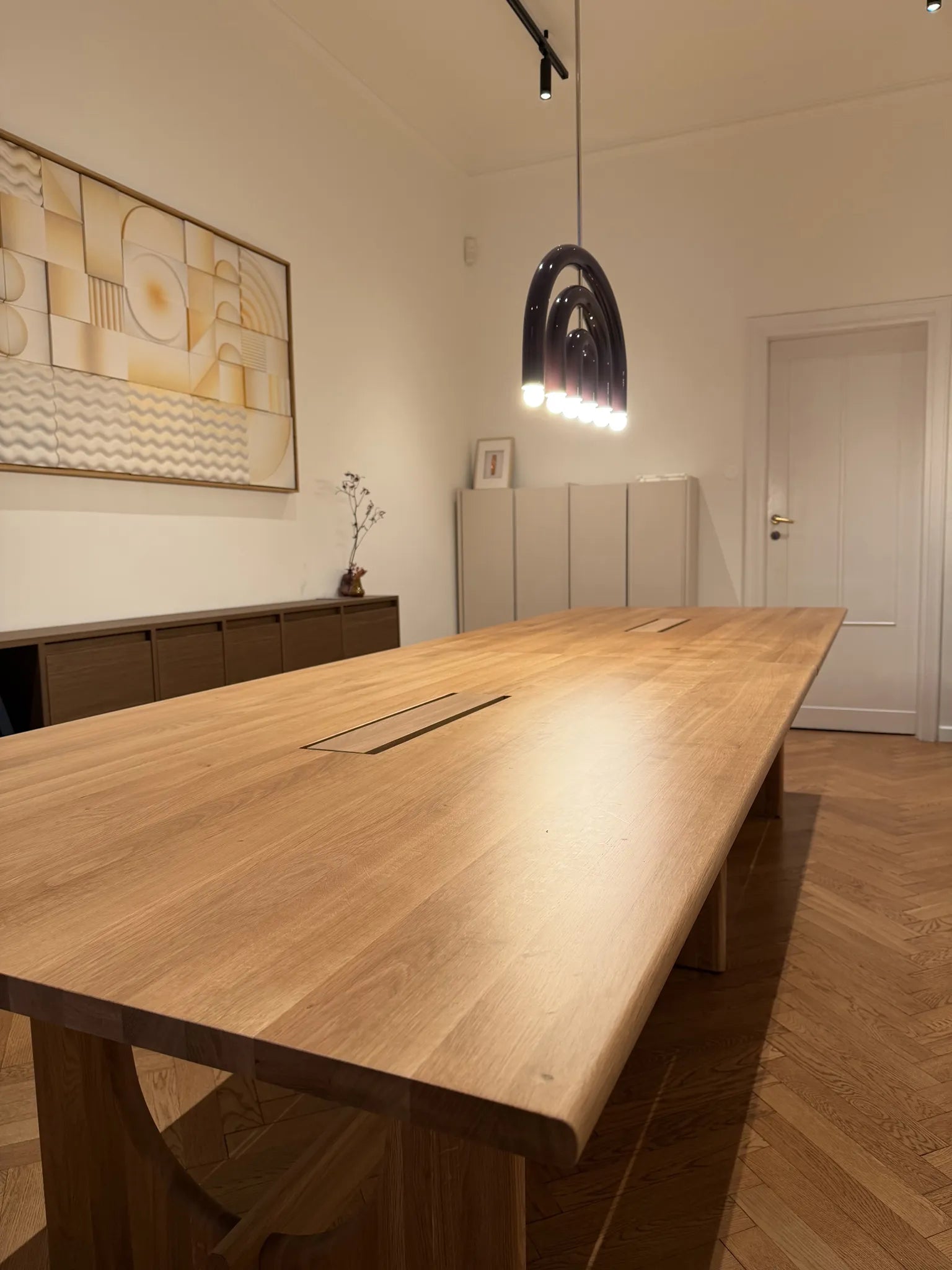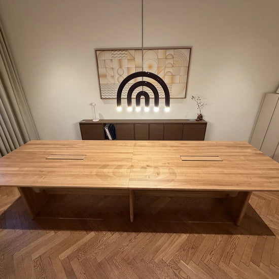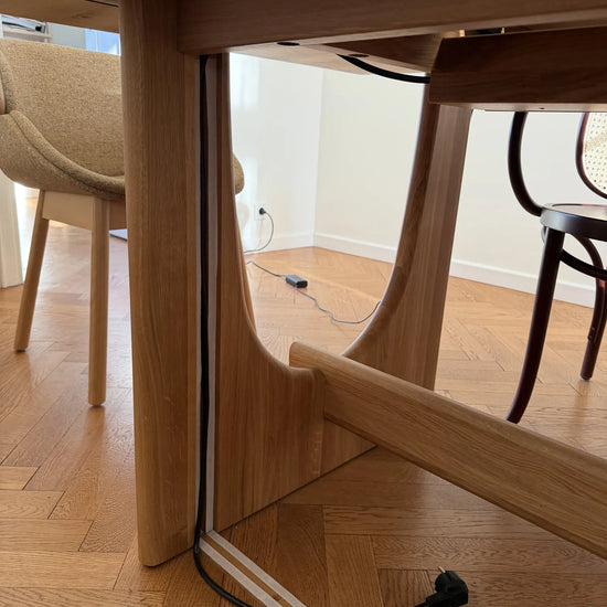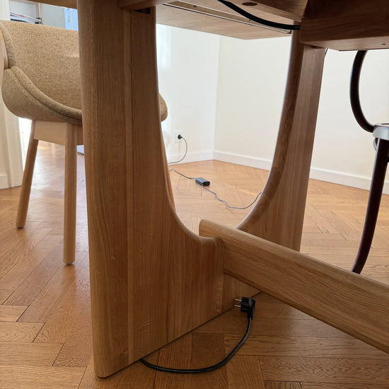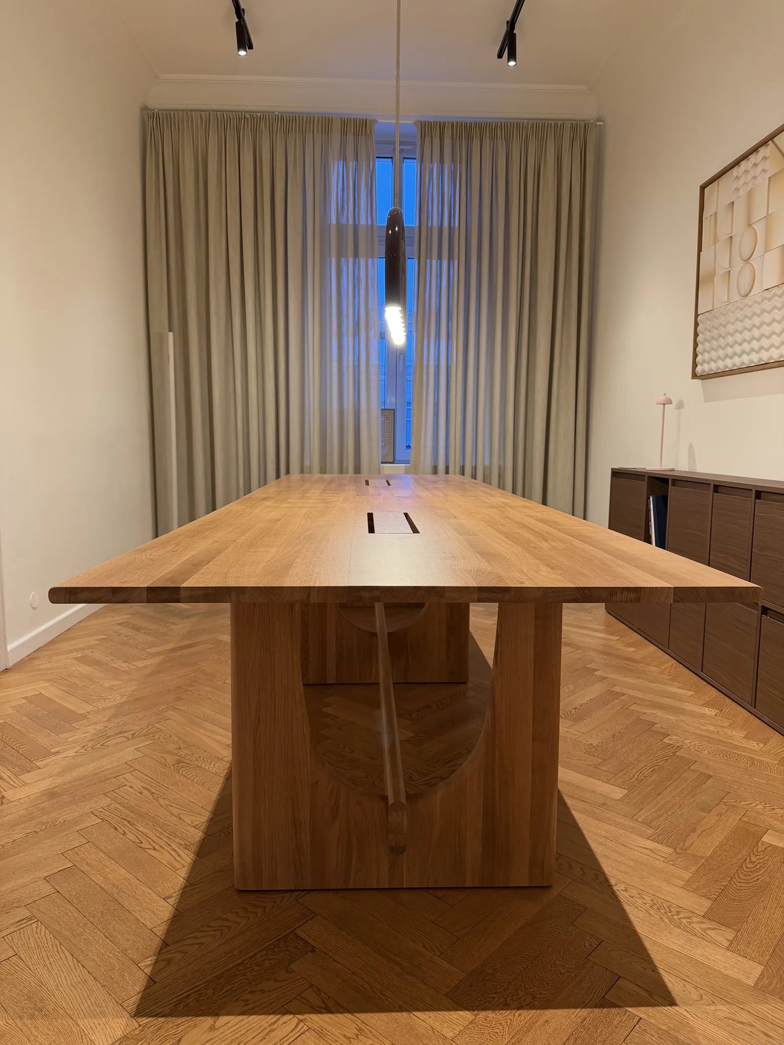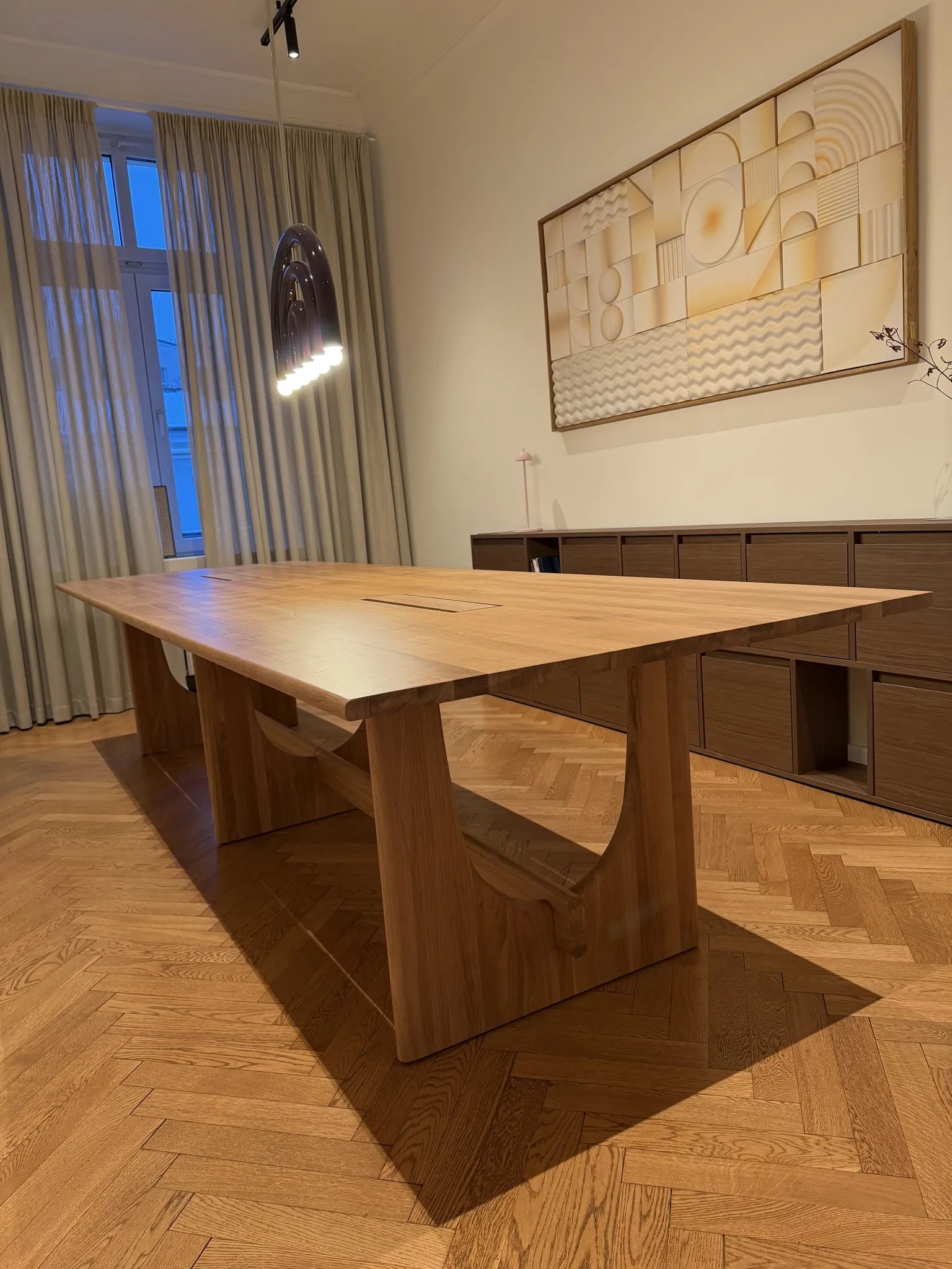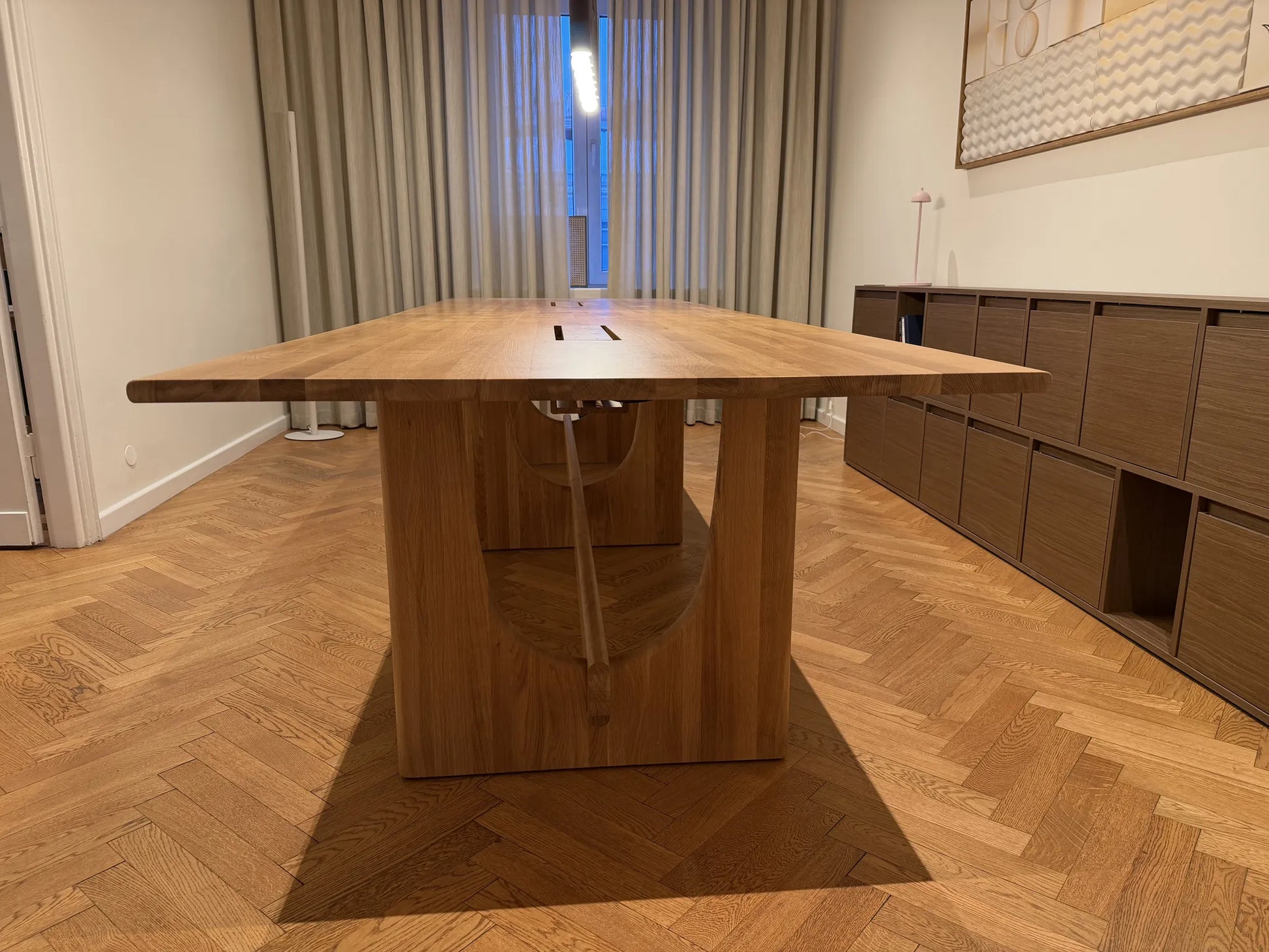 Przemyślane detale, takie jak dyskretnie ukryte gniazdka elektryczne, umożliwiają płynne przejście od spotkań konferencyjnych do indywidualnej przestrzeni do pracy – idealnej na laptopa i filiżankę kawy. Miękkie, zaokrąglone krawędzie zapewniają wygodę użytkowania, a delikatnie zakrzywione podstawy dodają konstrukcji wizualnej lekkości i harmonii.
