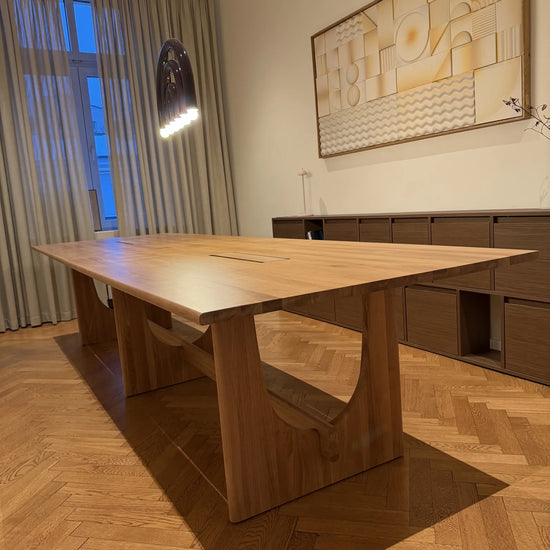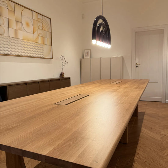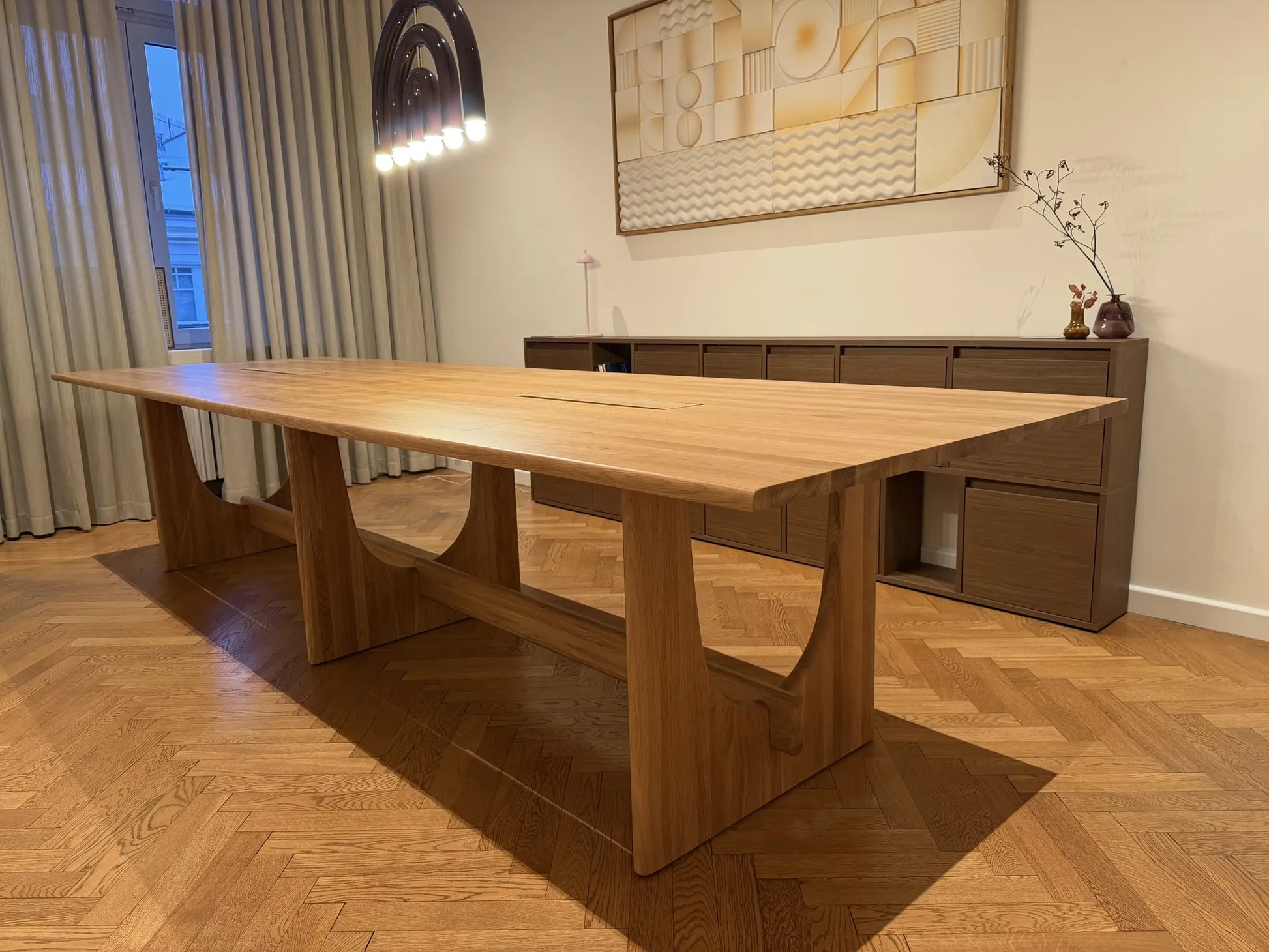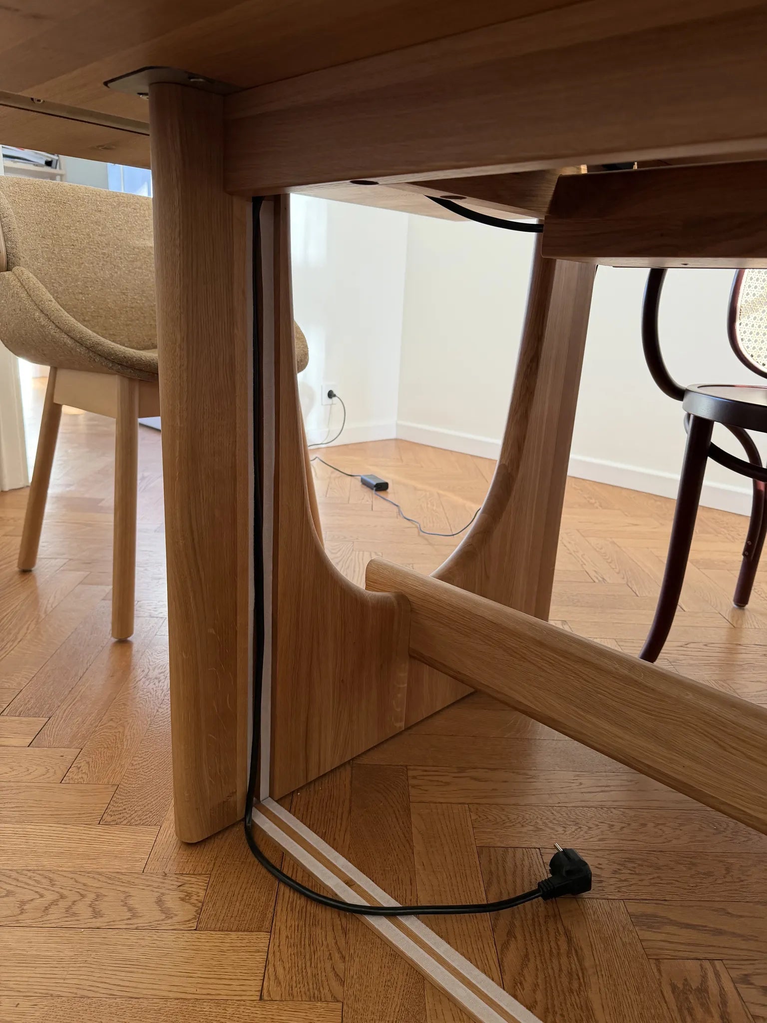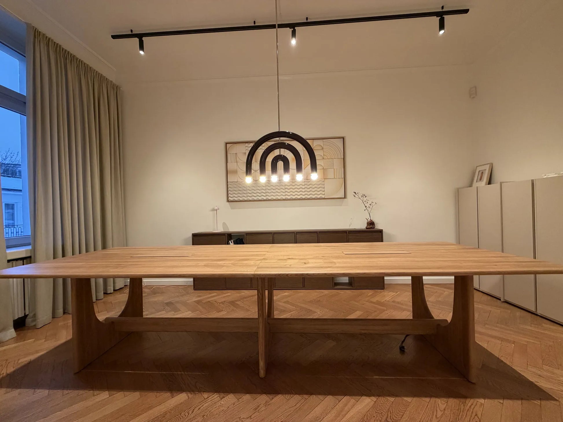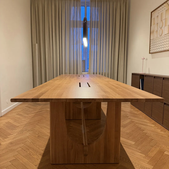 Przemyślane detale, takie jak dyskretnie ukryte gniazdka elektryczne, umożliwiają płynne przejście od spotkań konferencyjnych do indywidualnej przestrzeni do pracy – idealnej na laptopa i filiżankę kawy. Miękkie, zaokrąglone krawędzie zapewniają wygodę użytkowania, a delikatnie zakrzywione podstawy dodają konstrukcji wizualnej lekkości i harmonii.