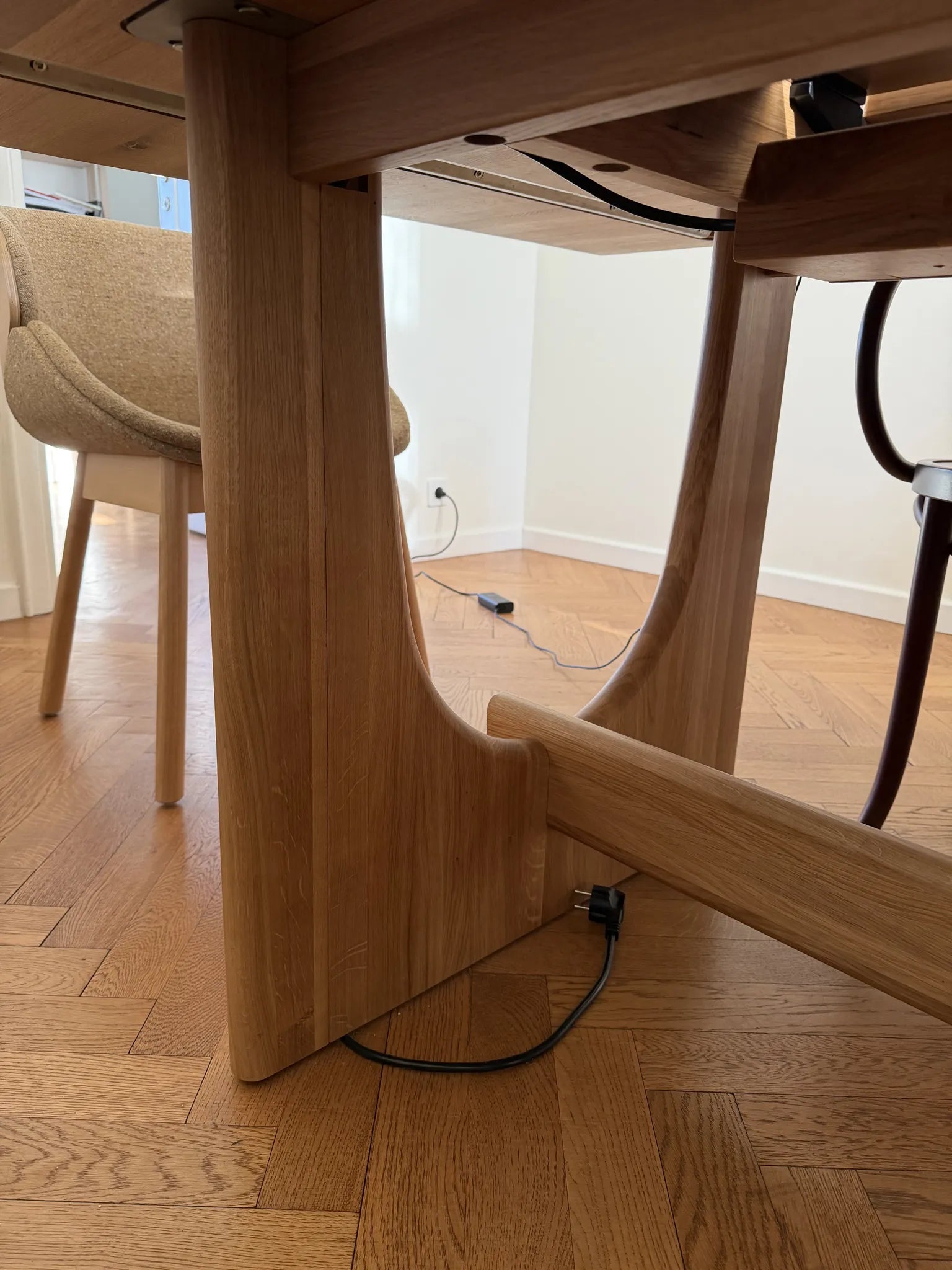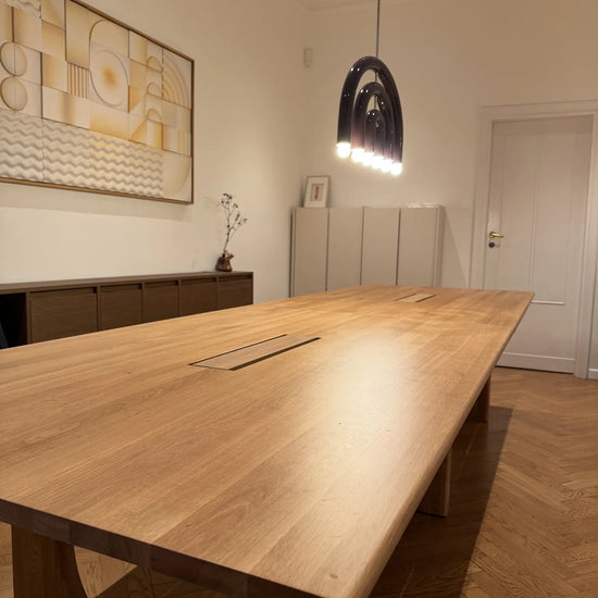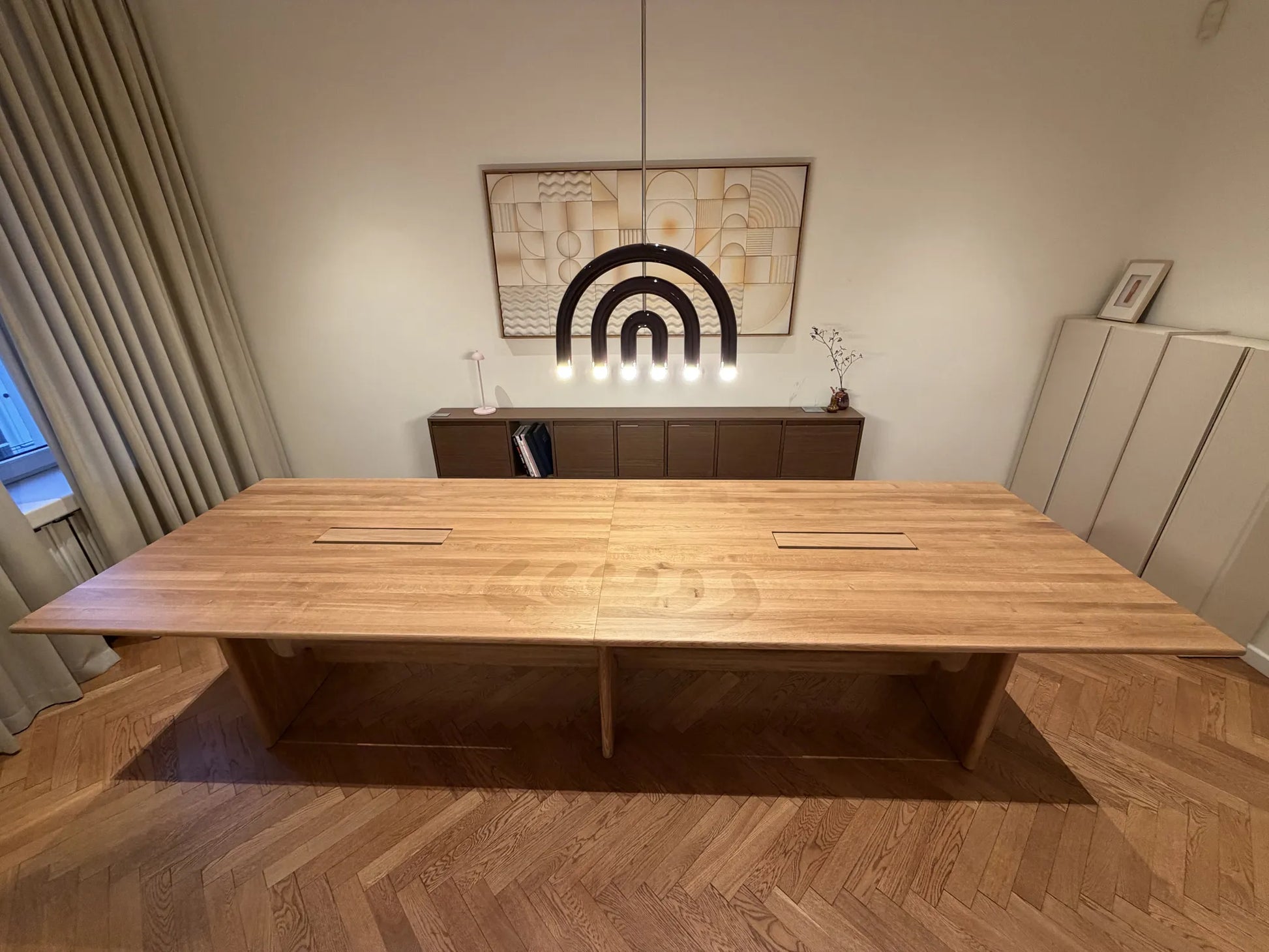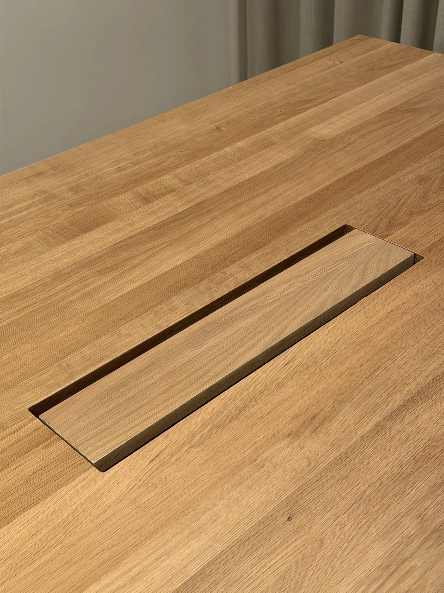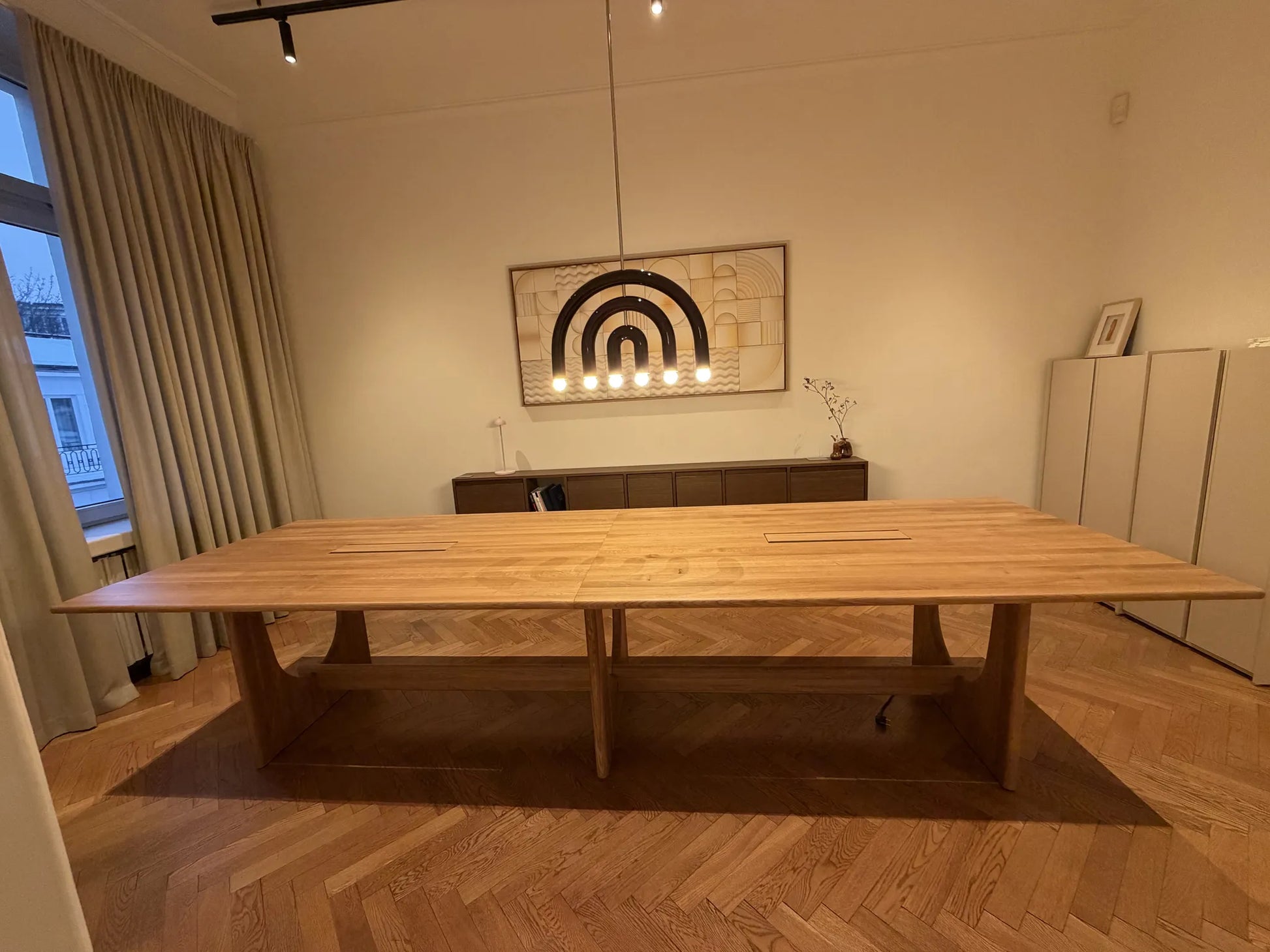 Przemyślane detale, takie jak dyskretnie ukryte gniazdka elektryczne, umożliwiają płynne przejście od spotkań konferencyjnych do indywidualnej przestrzeni do pracy – idealnej na laptopa i filiżankę kawy. Miękkie, zaokrąglone krawędzie zapewniają wygodę użytkowania, a delikatnie zakrzywione podstawy dodają konstrukcji wizualnej lekkości i harmonii.
