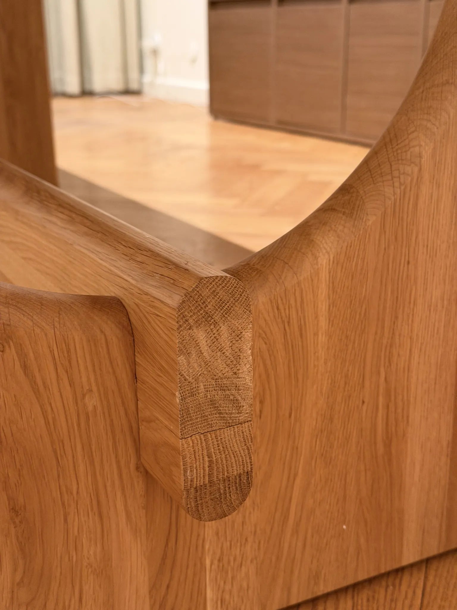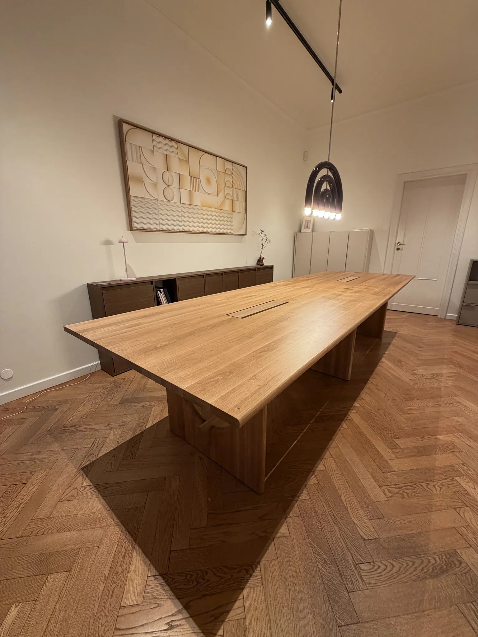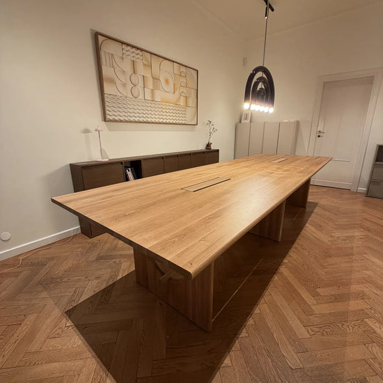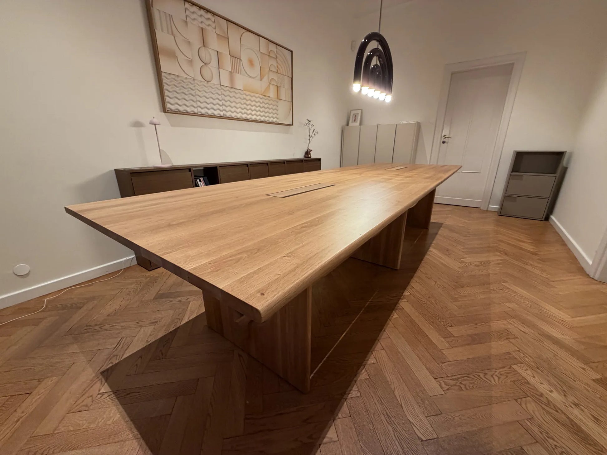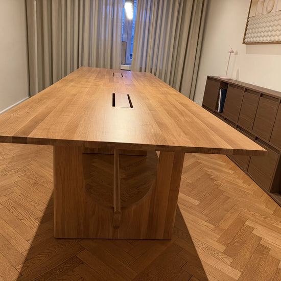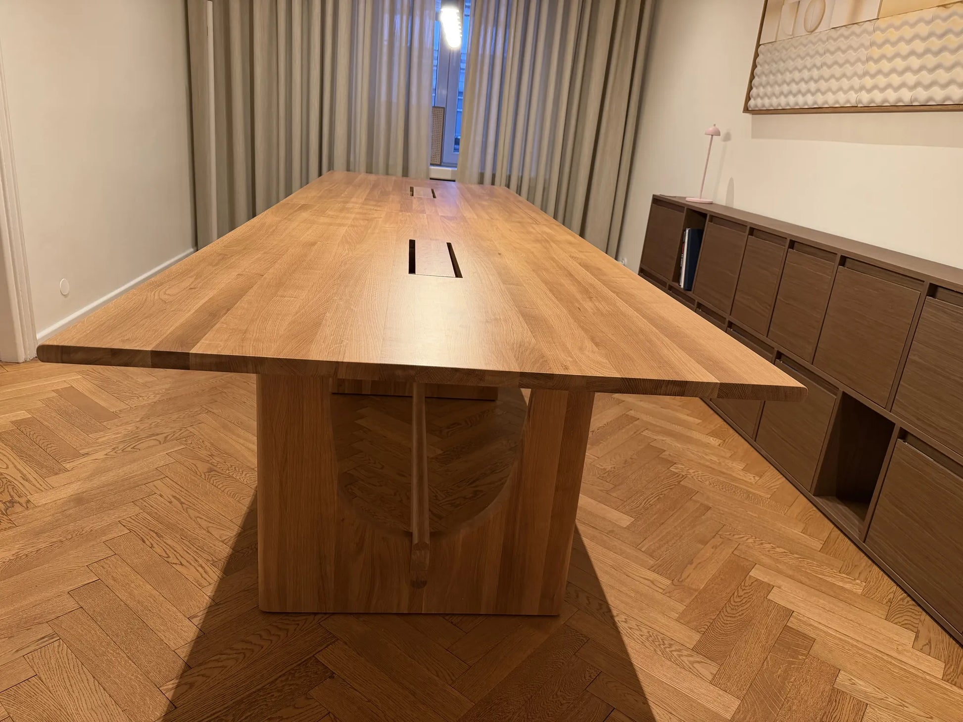 Przemyślane detale, takie jak dyskretnie ukryte gniazdka elektryczne, umożliwiają płynne przejście od spotkań konferencyjnych do indywidualnej przestrzeni do pracy – idealnej na laptopa i filiżankę kawy. Miękkie, zaokrąglone krawędzie zapewniają wygodę użytkowania, a delikatnie zakrzywione podstawy dodają konstrukcji wizualnej lekkości i harmonii.