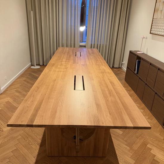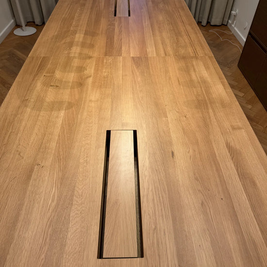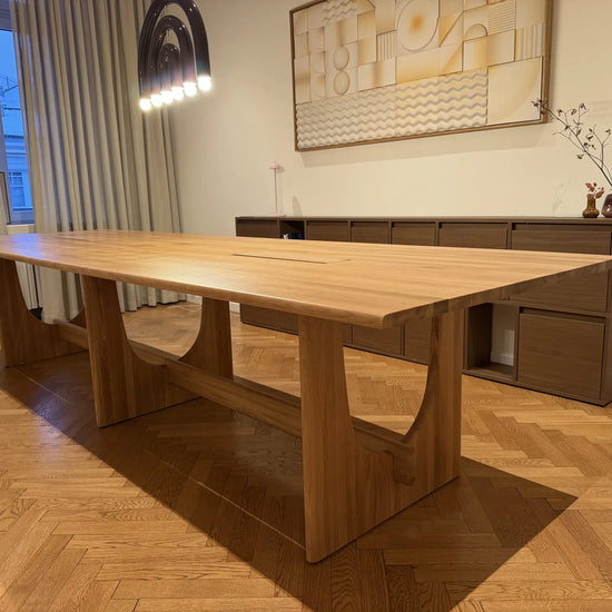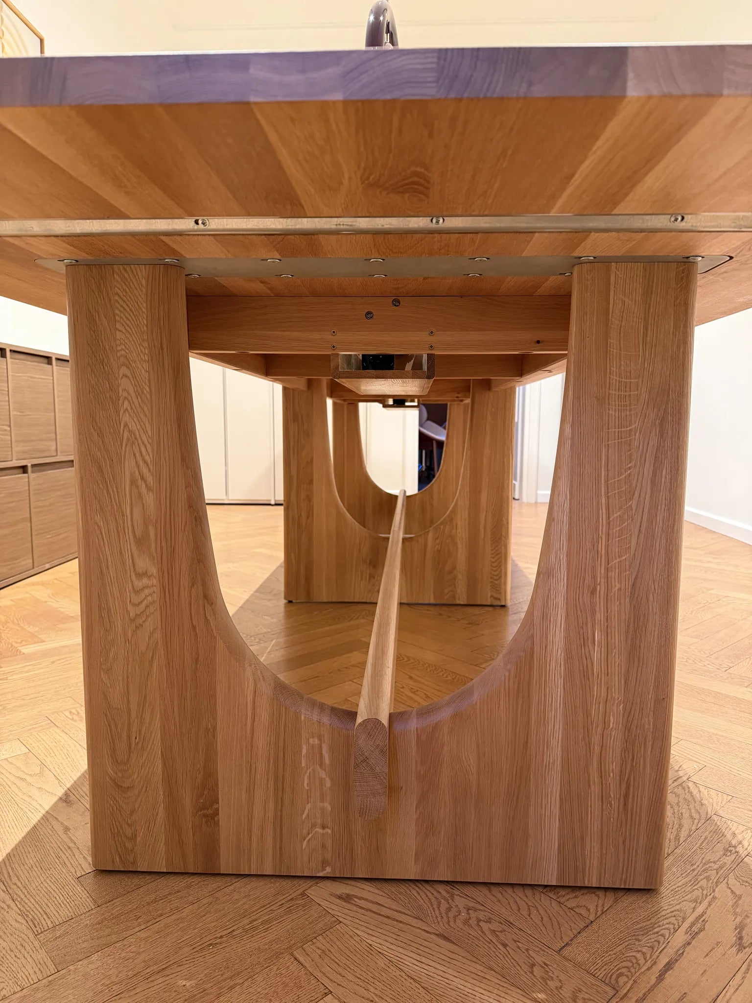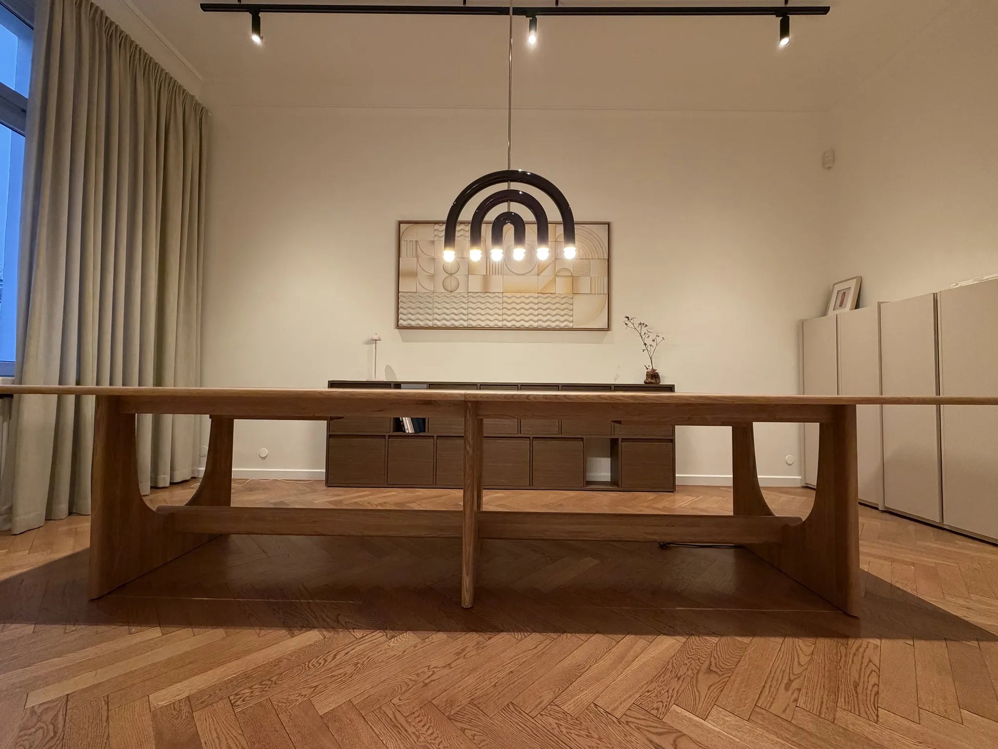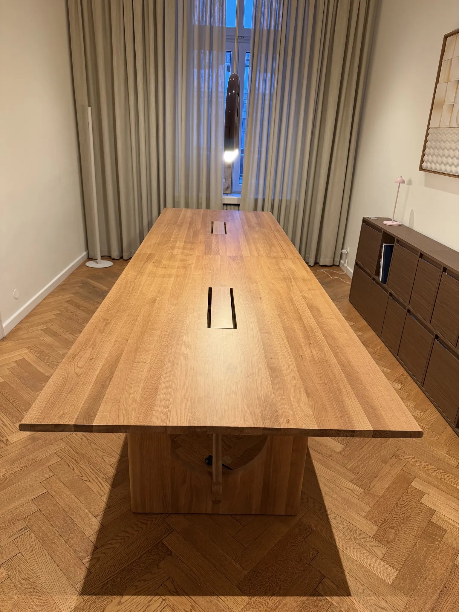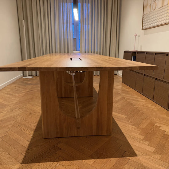 Przemyślane detale, takie jak dyskretnie ukryte gniazdka elektryczne, umożliwiają płynne przejście od spotkań konferencyjnych do indywidualnej przestrzeni do pracy – idealnej na laptopa i filiżankę kawy. Miękkie, zaokrąglone krawędzie zapewniają wygodę użytkowania, a delikatnie zakrzywione podstawy dodają konstrukcji wizualnej lekkości i harmonii.