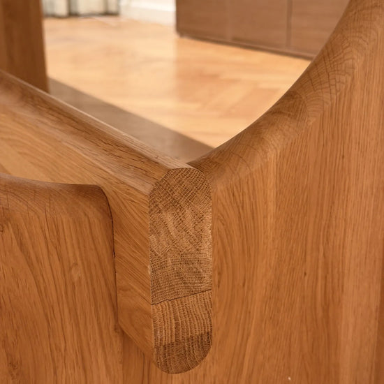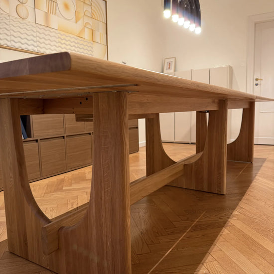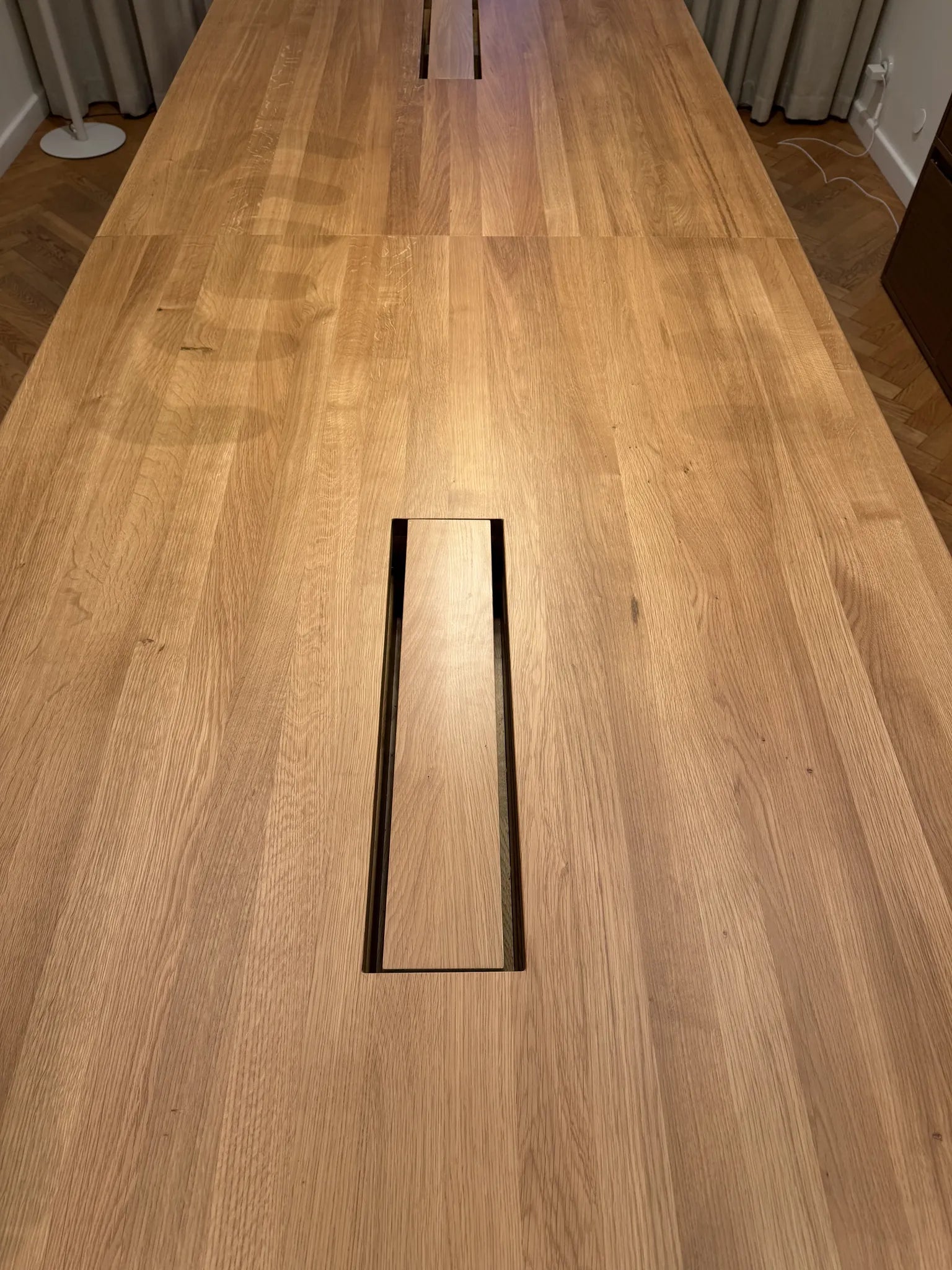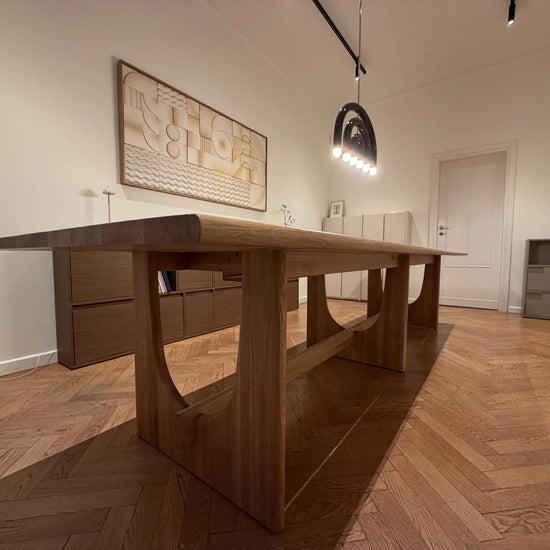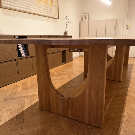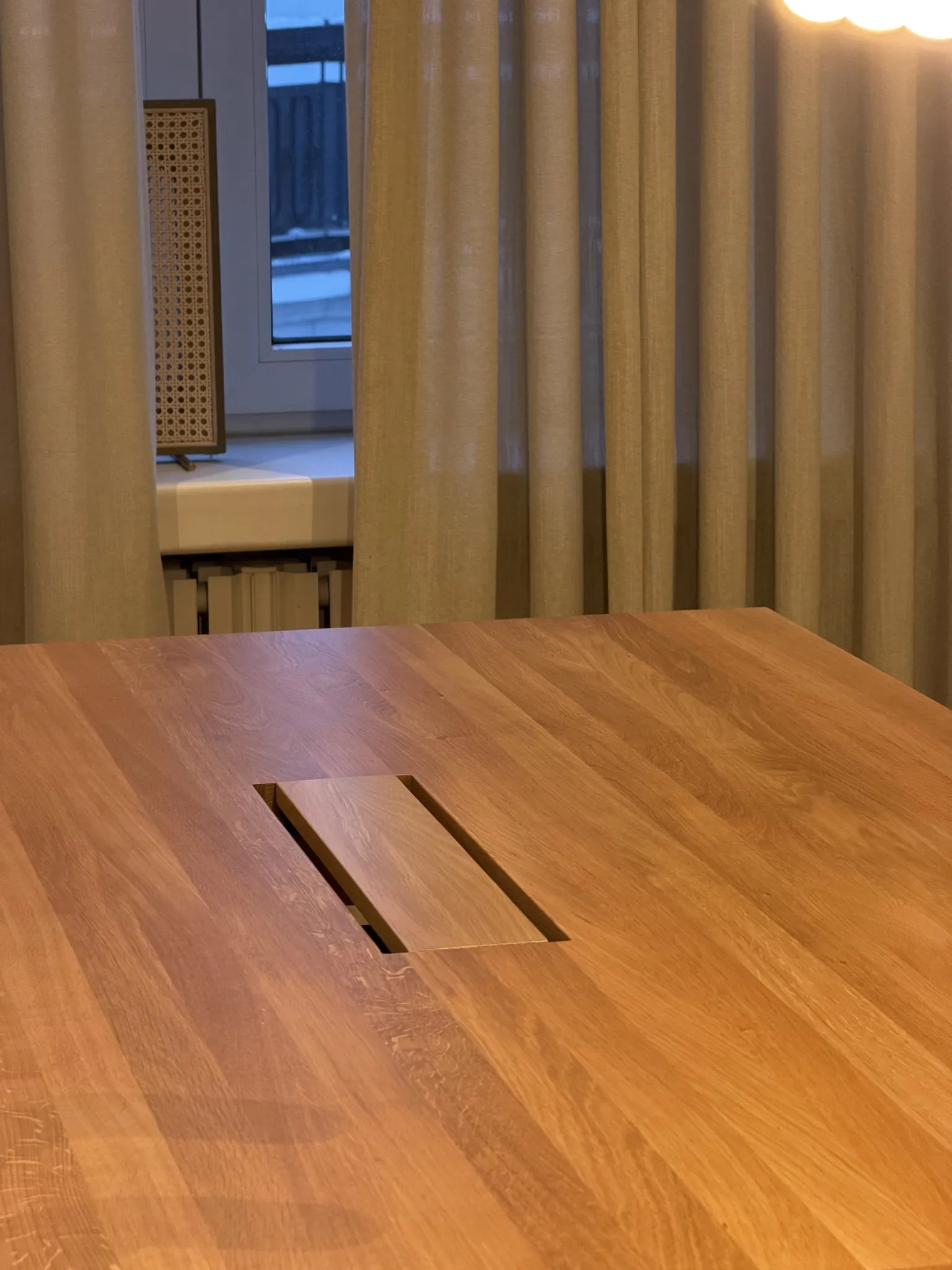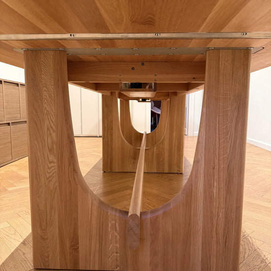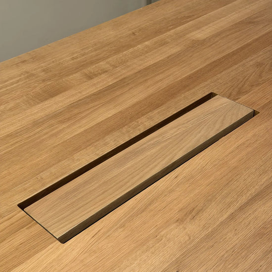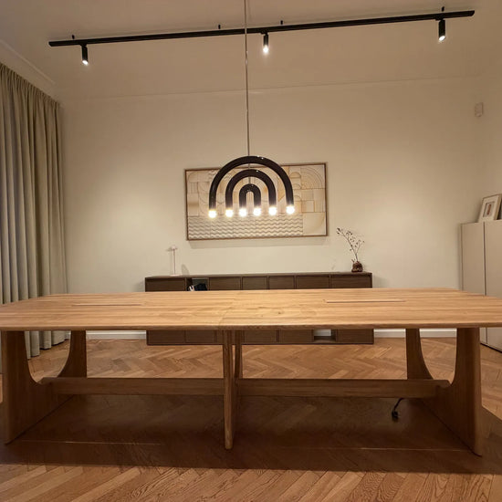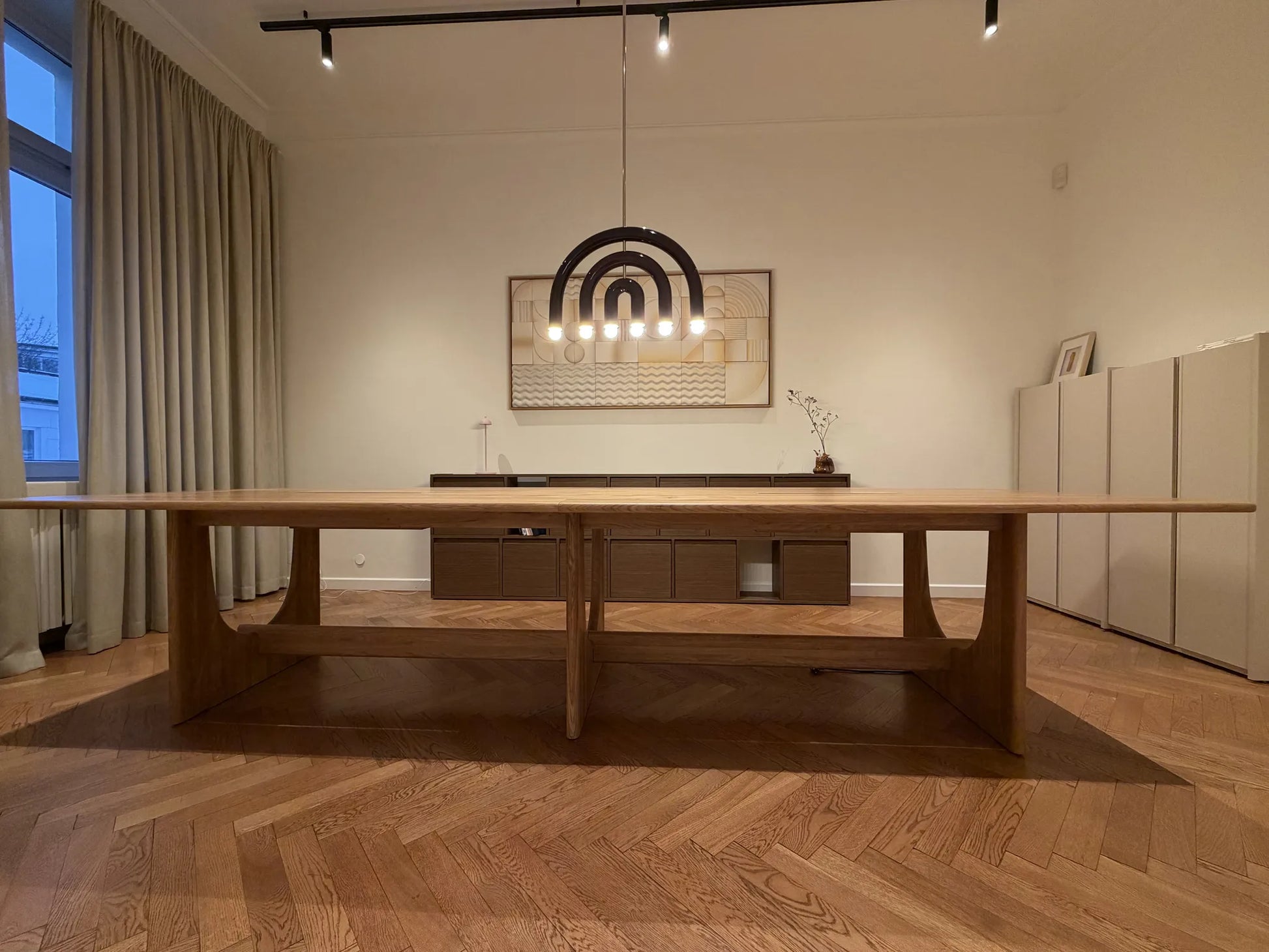 Przemyślane detale, takie jak dyskretnie ukryte gniazdka elektryczne, umożliwiają płynne przejście od spotkań konferencyjnych do indywidualnej przestrzeni do pracy – idealnej na laptopa i filiżankę kawy. Miękkie, zaokrąglone krawędzie zapewniają wygodę użytkowania, a delikatnie zakrzywione podstawy dodają konstrukcji wizualnej lekkości i harmonii.