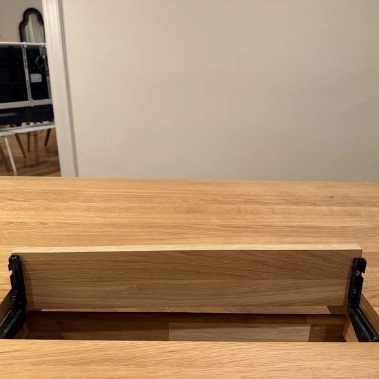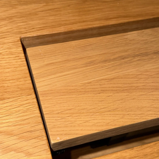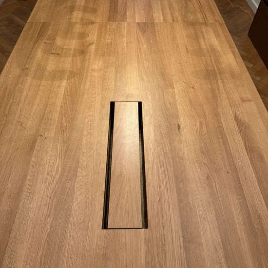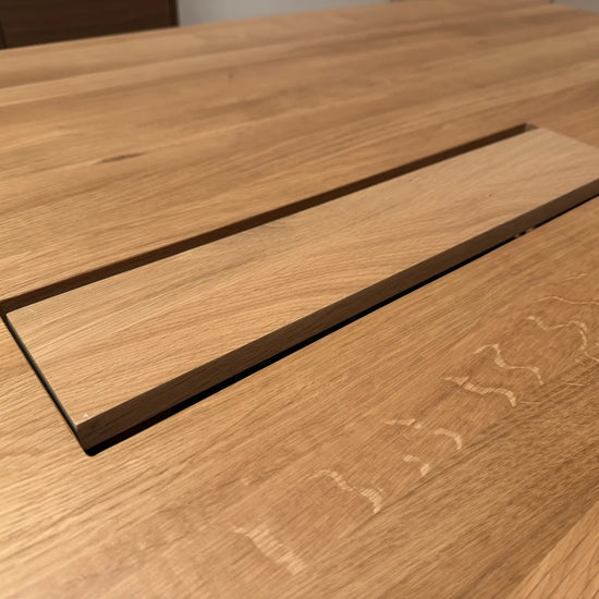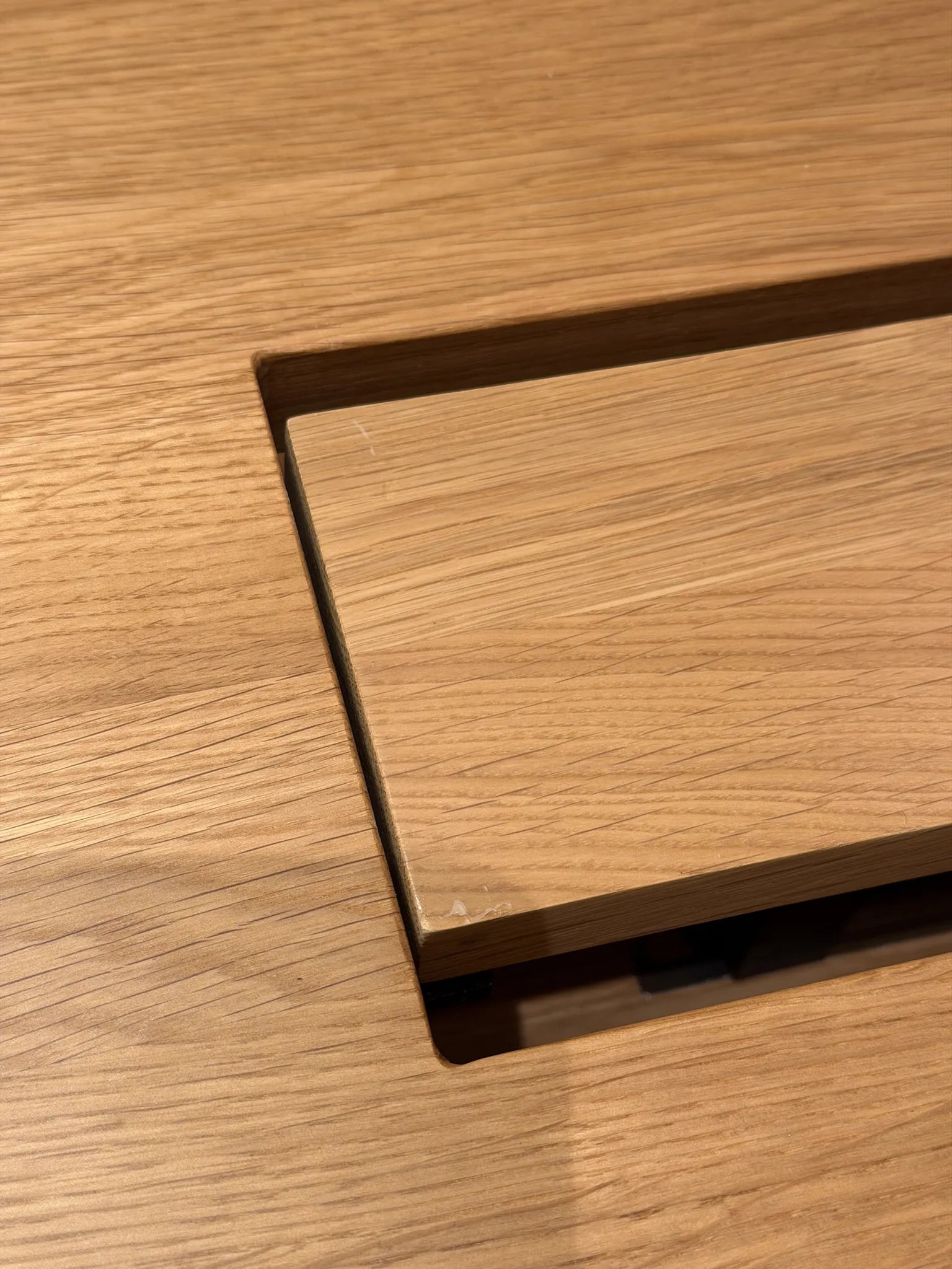 Prototyp Sund L 350 z wadami wynikającymi z wielokrotnego transportowania na targi oraz montażu i demontażu – wady widoczne na zdjęciach, m.in. mała rysa na blacie, ruchome klapki w blacie o innym stopniu połysku niż powierzchnia blatu, mechanizm klapek w blacie nie pracujący w pełni płynnie podczas otwierania i zamykania oraz przyklejony fragment belki dolnej.