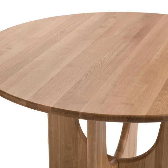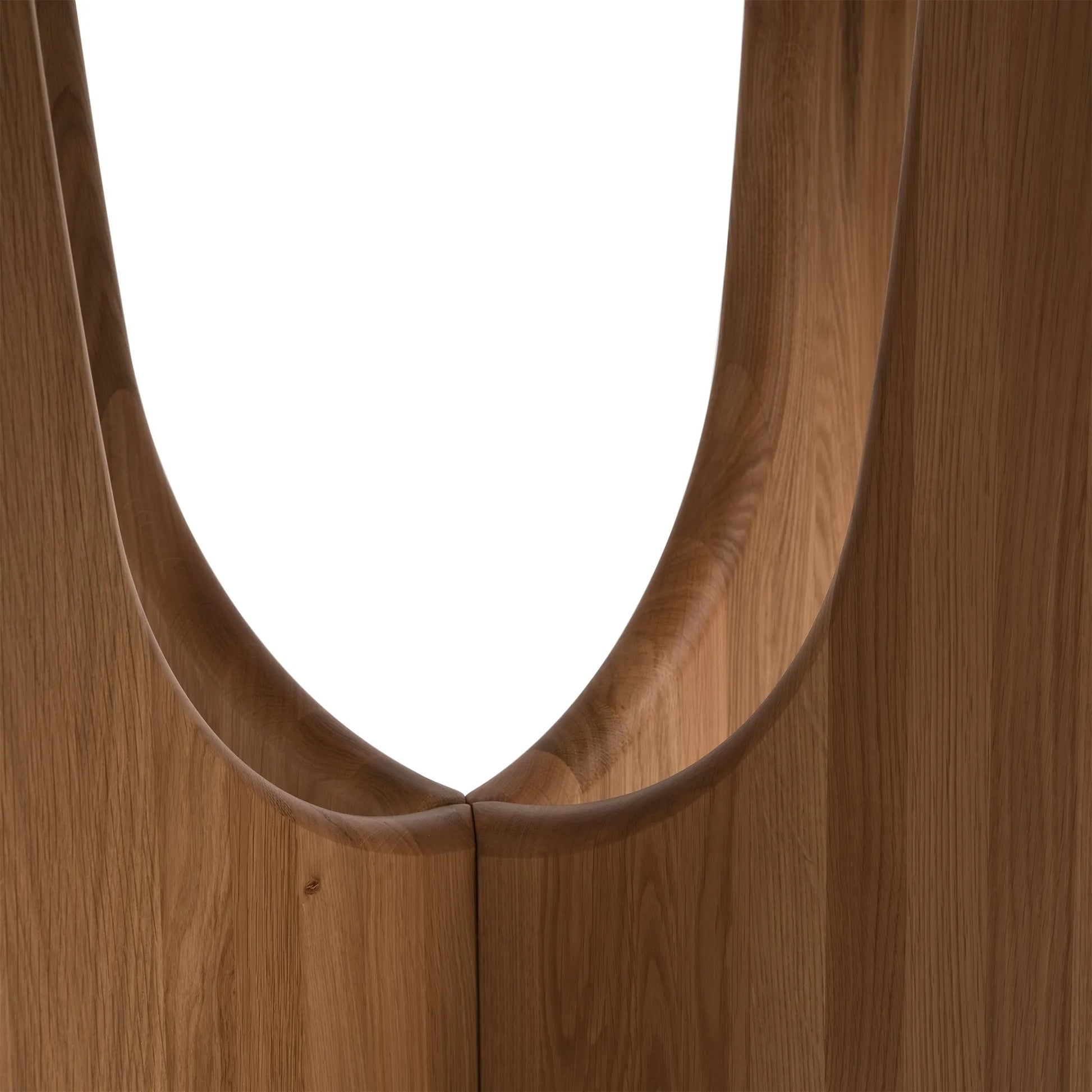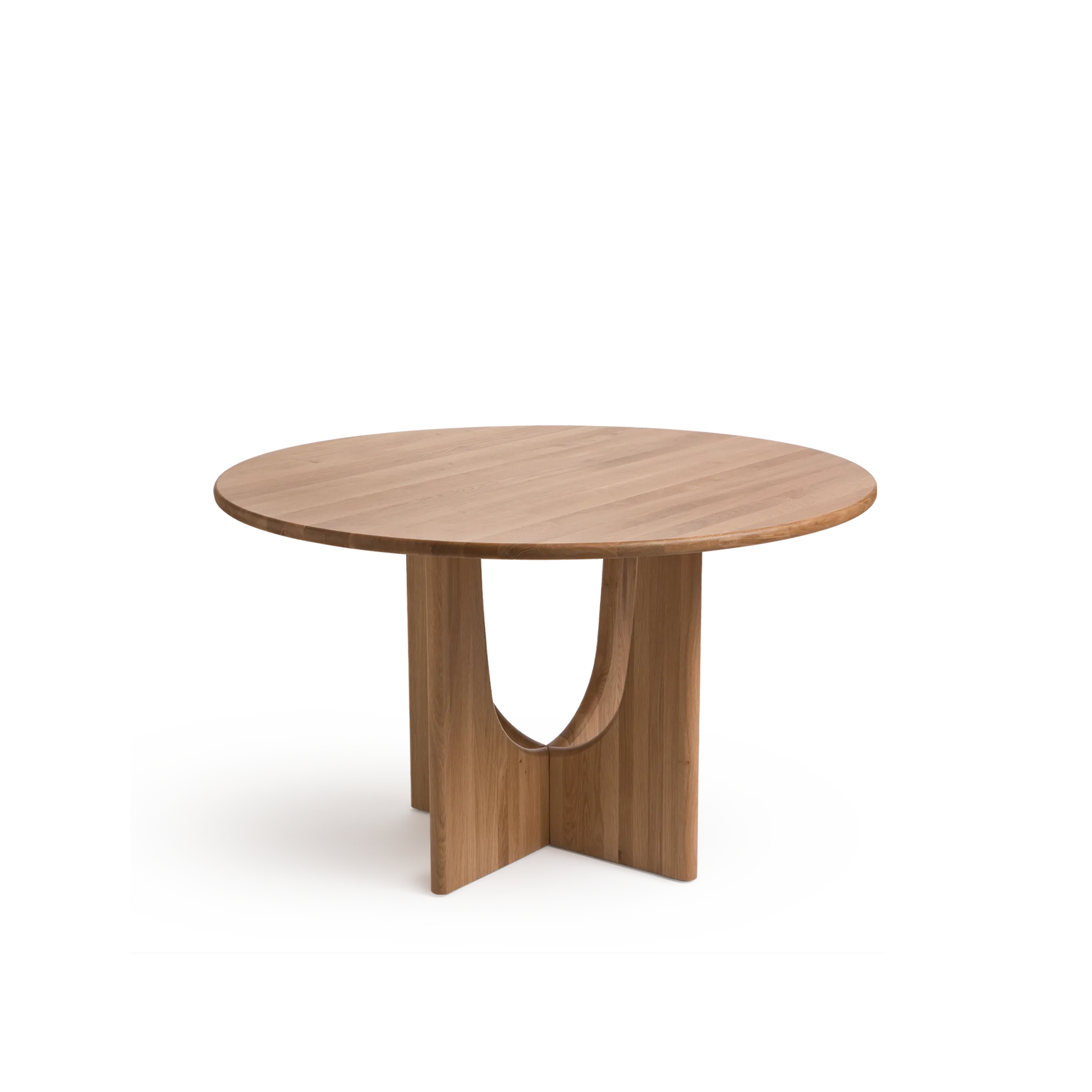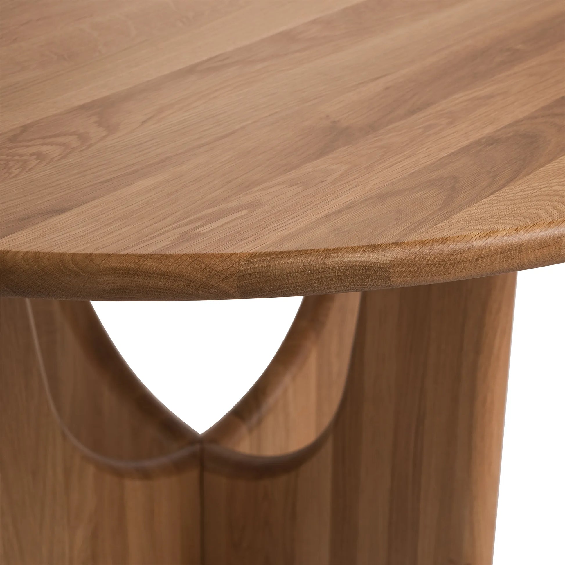 Stół Sund Rd 130 łączy ciepło naturalnego drewna z harmonijną, zapraszającą formą. Obszerny okrągły blat z litego drewna dębowego wsparty jest na charakterystycznej, krzyżowej podstawie o miękkiej, zakrzywionej linii, która nadaje konstrukcji wizualnej lekkości i harmonii.