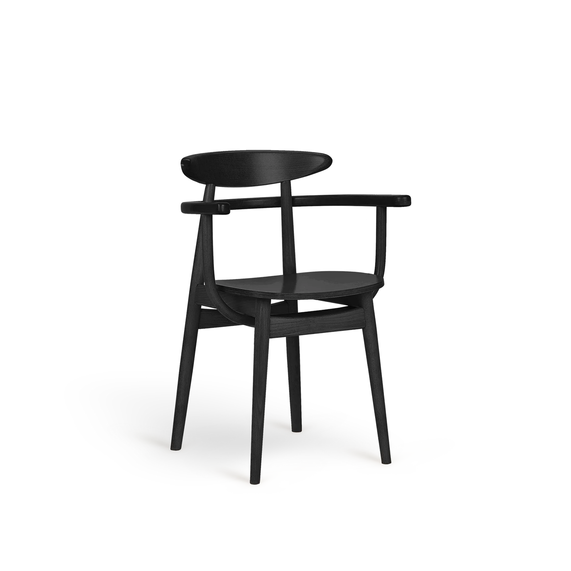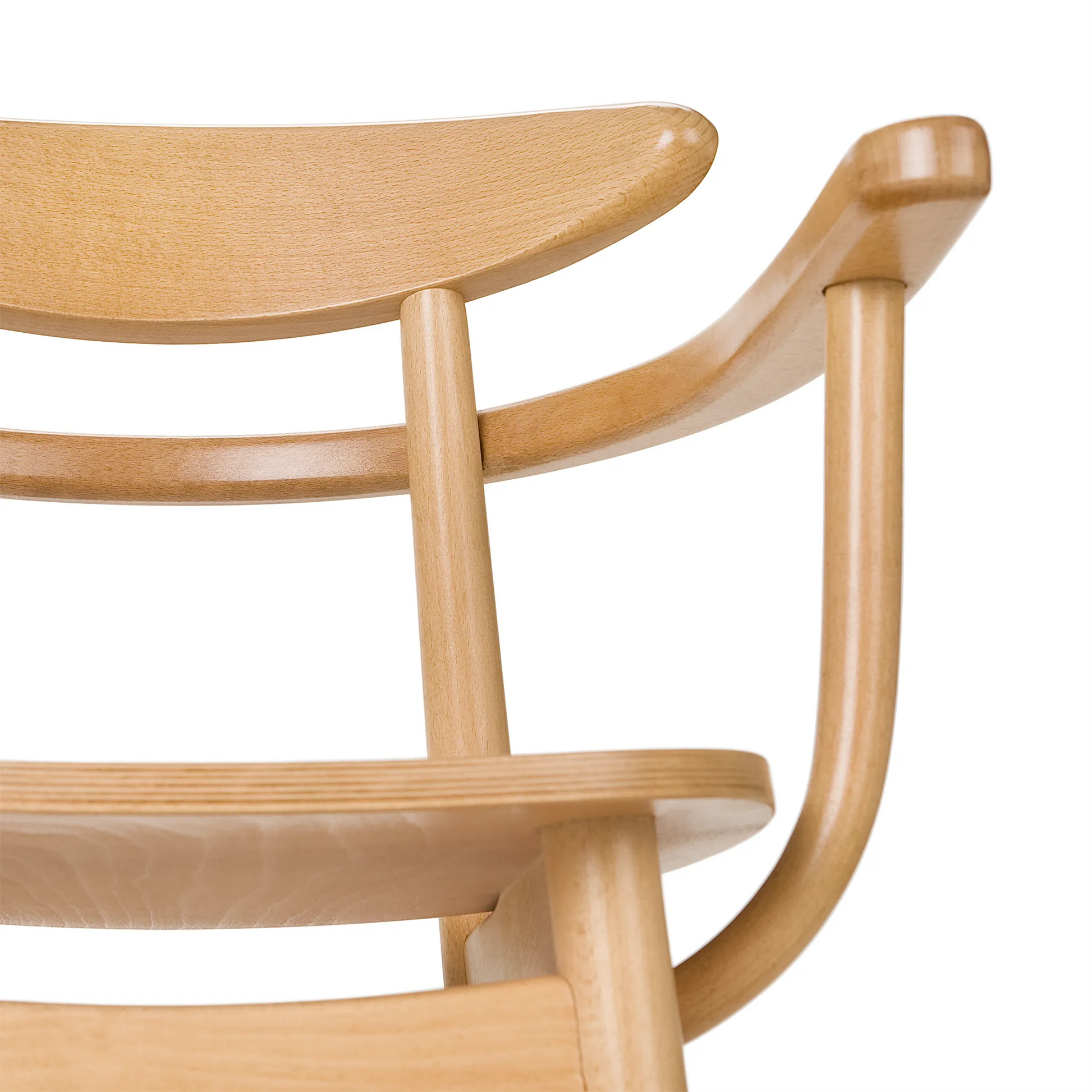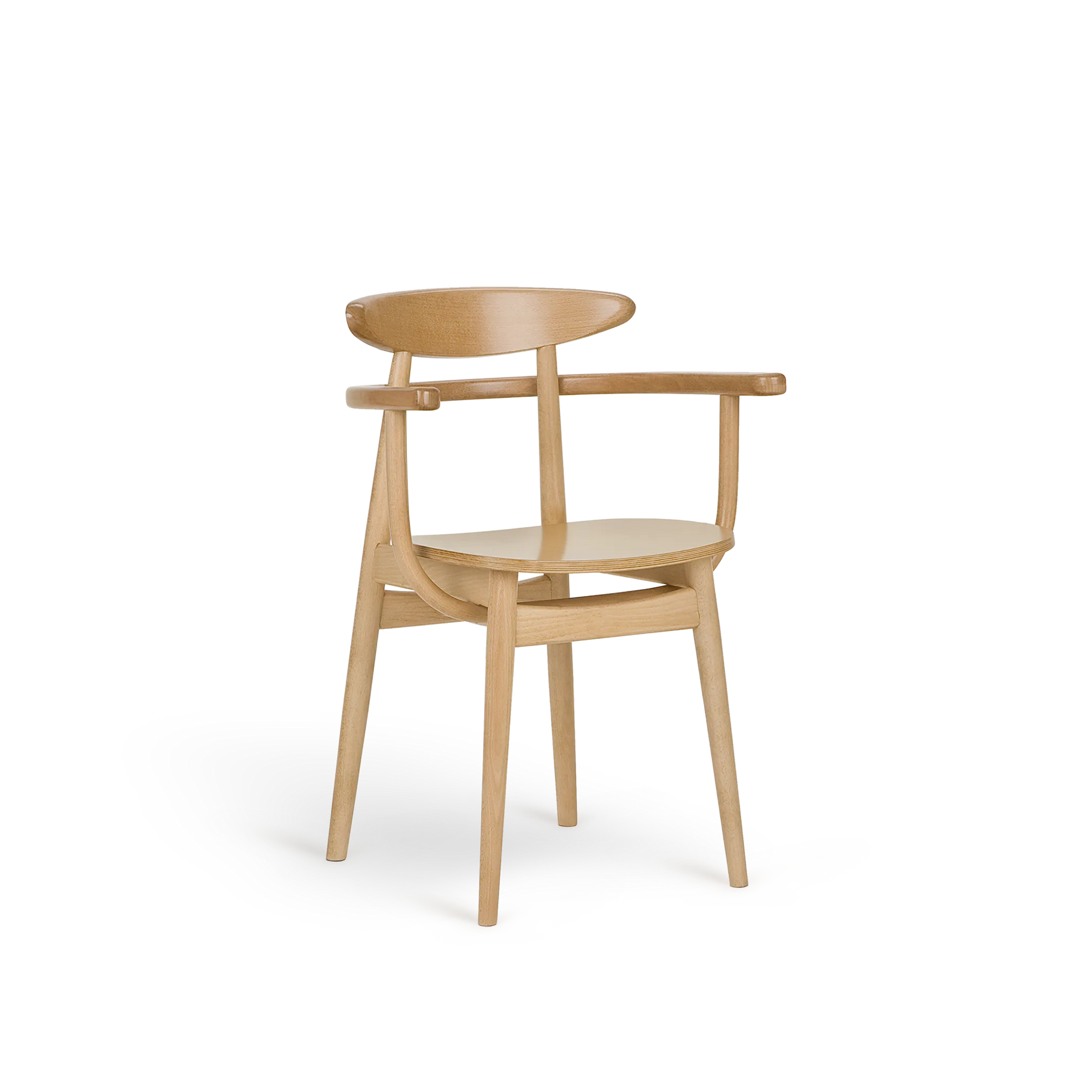 Krzesło Yesterday B-4101 z podłokietnikami łączy klasyczną estetykę z wygodą codziennego użytkowania. Lekko zaokrąglone oparcie i smukłe linie konstrukcji nadają mu lekkości. Charakterystycznym elementem jest poręcz z podpórką z giętego bukowego pałąka, która łączy się z oparciem.